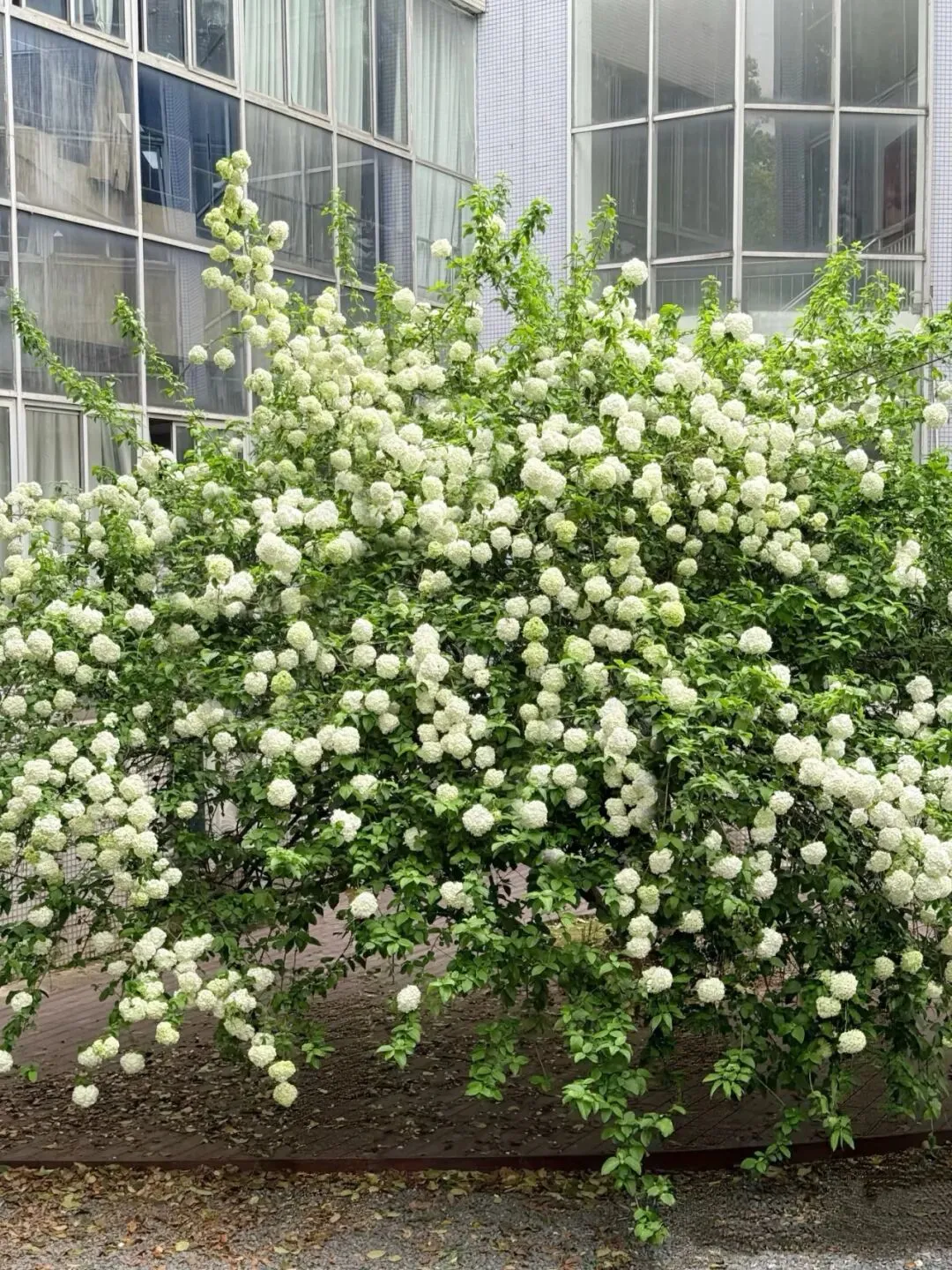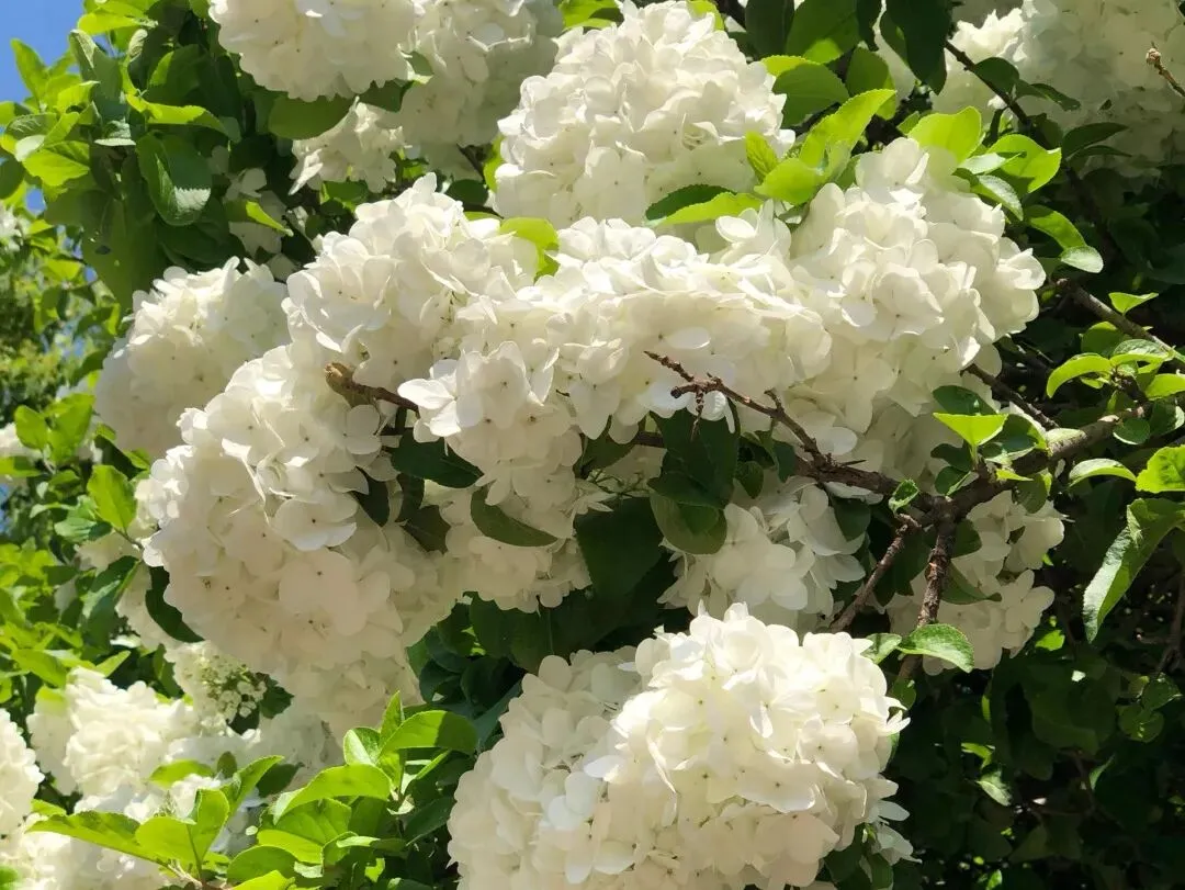 圆圆的木绣球,像蓬松的冰淇淋球,颜色从青绿慢慢变成纯白,干净又雅致,搭配绿树、亭台,拍照温柔又出片,特别适合叔叔阿姨们合影。