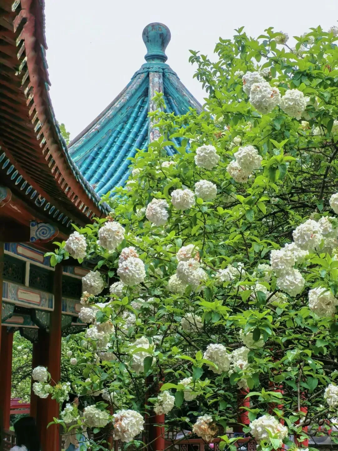 2.烈士公园(纪念长廊旁,东门进入更近):木绣球与古色亭台相映,素雅又有韵味。