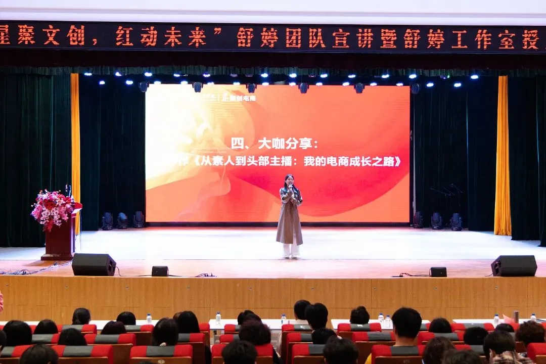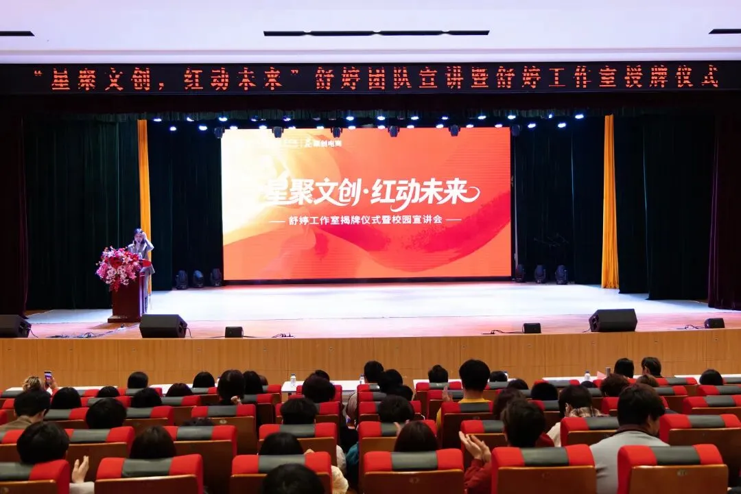 4月13日晚,长沙文创聚创电商产业学院灯火通明,“星聚文创,红动未来”——舒婷工作室揭牌仪式暨校园宣讲会在3号栋1楼多功能报告厅圆满举行。