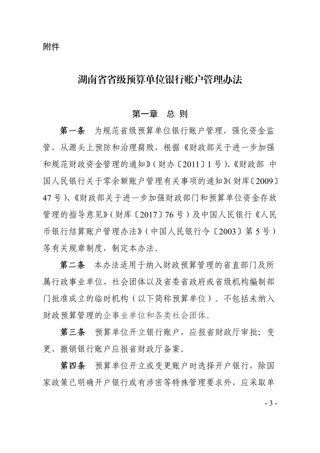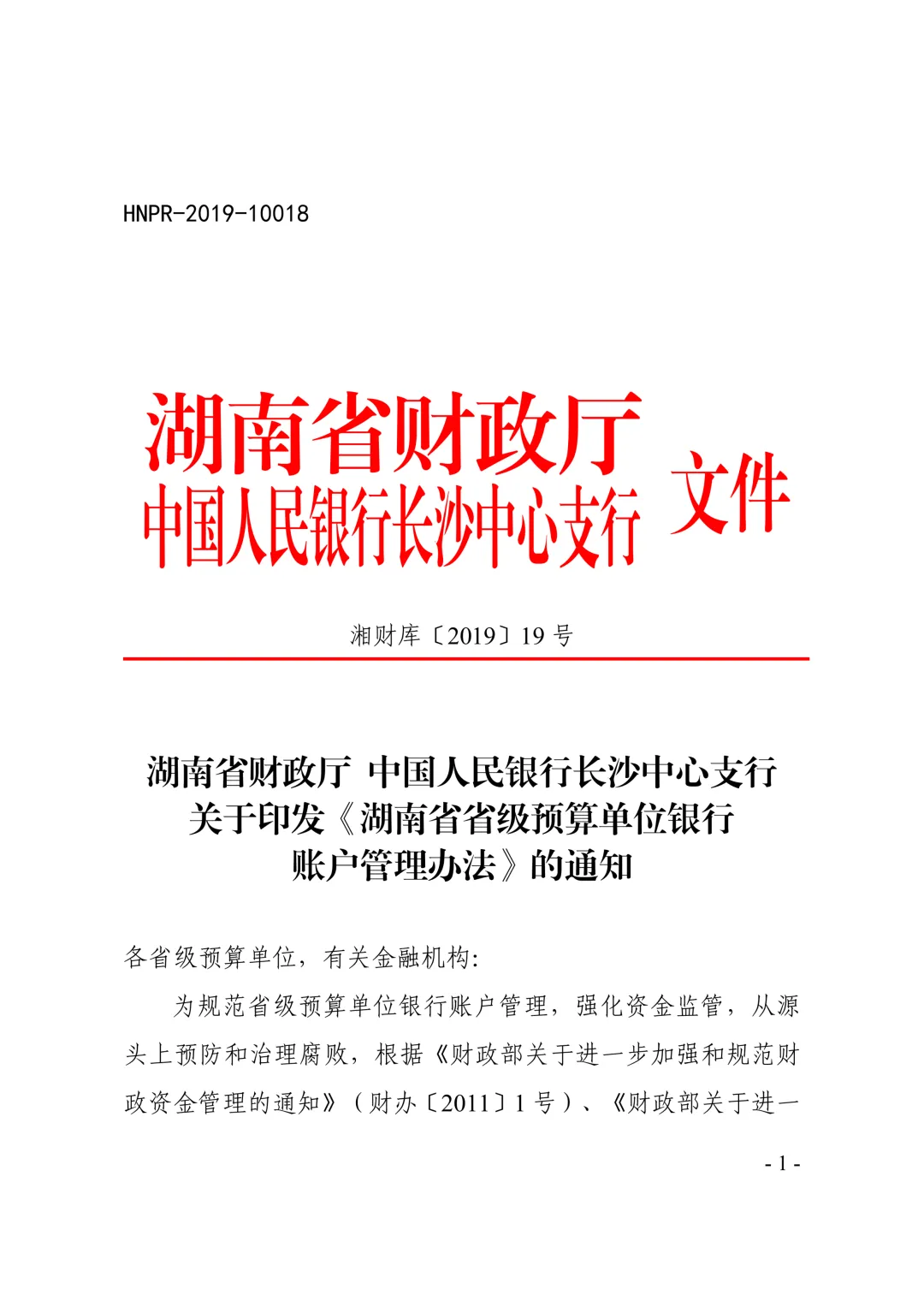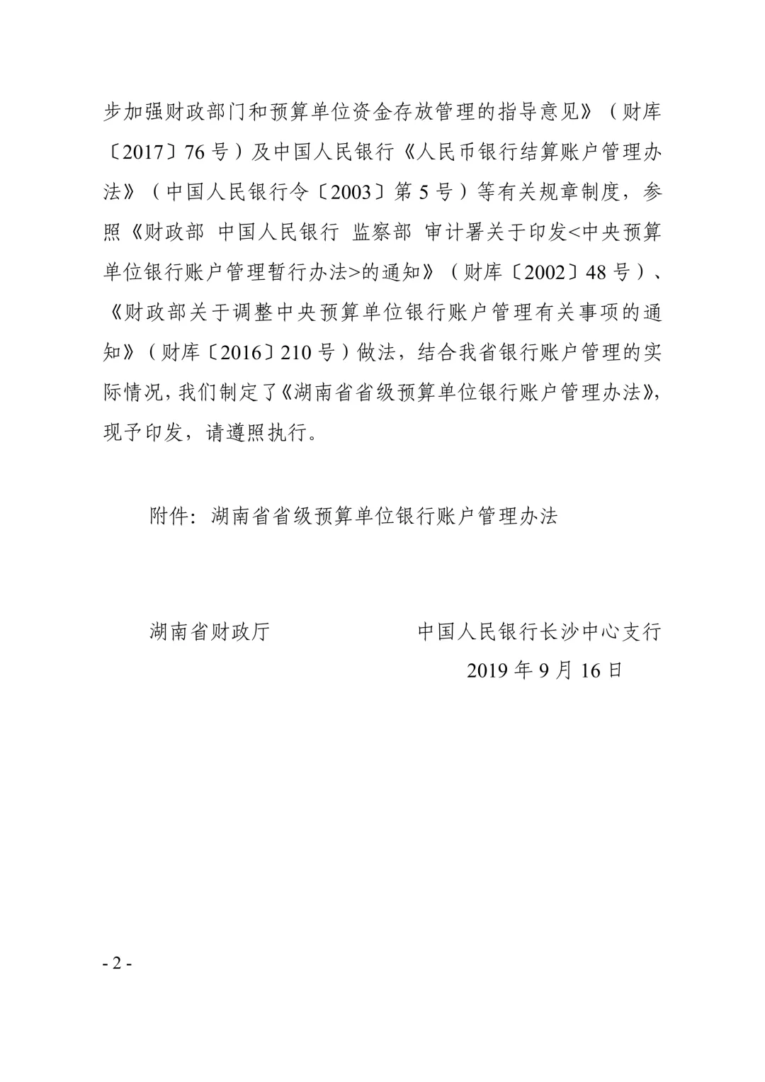 >湖南省财政厅 中国人民银行长沙中心支行关于印发《湖南省省级预算单位银行账户管理办法》的通知(湘财库〔2019〕19号 )