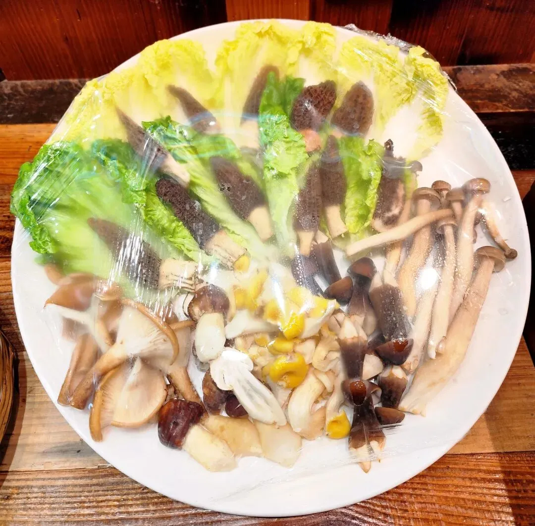 可惜天公不作美,到饭点时又开始下雨,我们五个人只带了两把伞,到了张家小院山脚下的停车场,我把伞让给了车上的一位女士,等我打算冲进雨里时,一位等候在一旁的服务员大姐见状拿了两把伞递过来。
