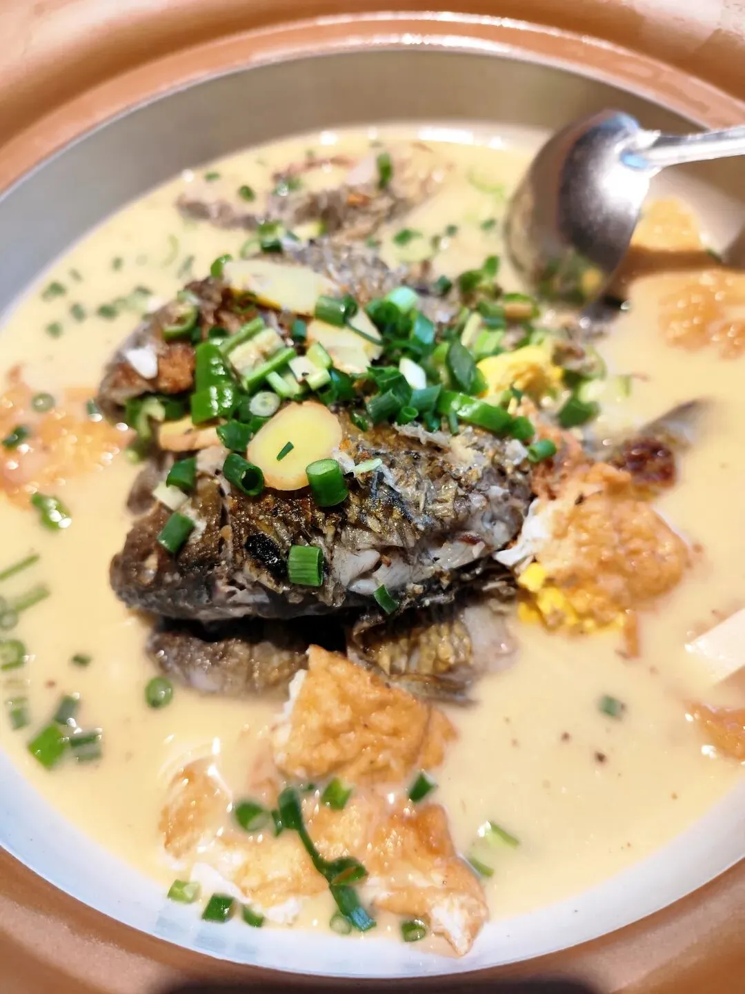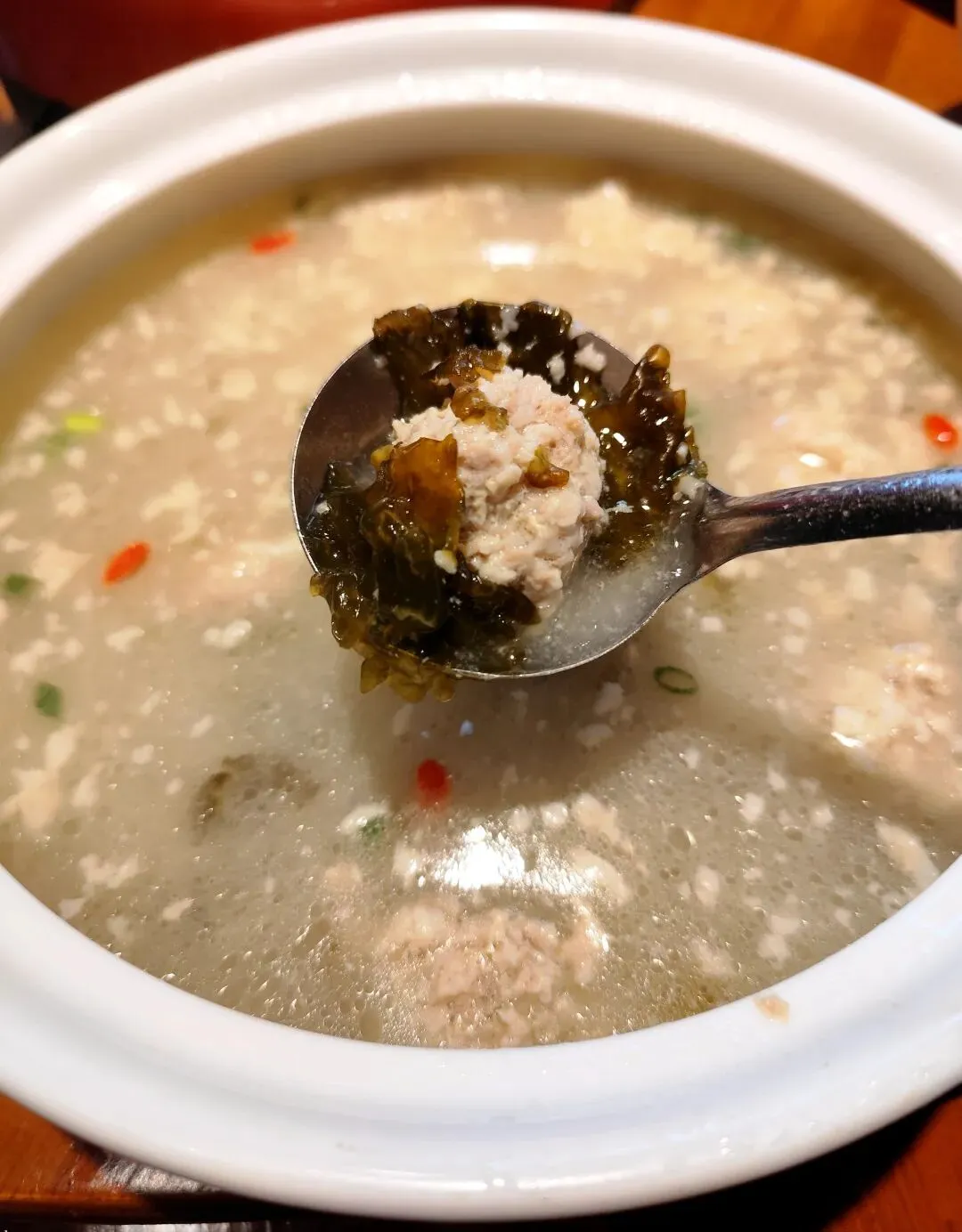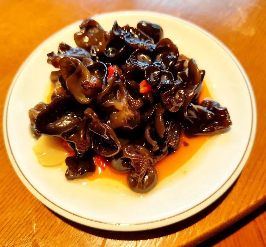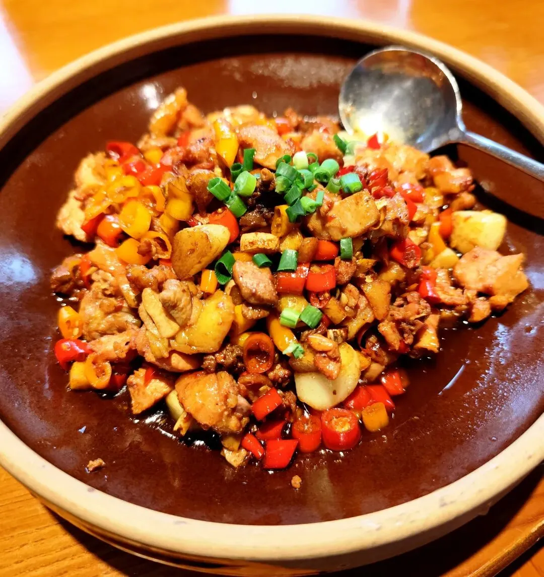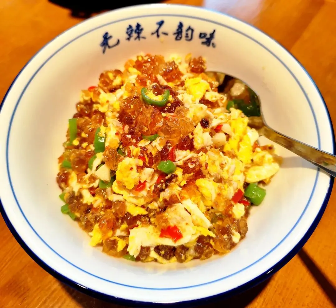 服务员说,包厢已经全部定出去了,点好菜,我们坐到了大厅里面。我们点了一大瓶饮料,大家都倒上一杯,继续上午的话题,聊了一阵子,就开始上菜了。我坐的地方不在上菜口,下面按照拍照顺序简单做个介绍:我最早是在炎陵吃到桃胶(感兴趣的朋友可以看看下面这篇),鸡蛋鲜香细嫩,桃胶QQ弹弹,少量剁椒和青椒等调味,我很喜欢。鸡肉炒制加了姜片、大蒜子、黄贡椒、红线椒和小米辣,最后撒葱花,鸡肉吃起来香辣入味,香气浓郁。鸡肉剁得小块,份量一般。这个菜一上桌,香气就飘散开来,鱼汤看起来很浓稠,鱼摆盘讲究,荷包蛋打散衬在四周。吃了一只鱼,新鲜味美,只是刺稍微多一点,老人小孩需要注意。腊肉经过煸炒,笋子吸收了腊肉的油脂,豆豉和蒜苗增加复合味道和清香,作为爱吃笋子的人,自然是停不下筷子。粑粑煎得很到位,糯叽叽的口感,混着蒿子特有的“清香”,吃了一个还想吃第二个。藠头切段,藠头的头部没有怎么拍散,腊肠倒是软糯易嚼,搭配有一些小米辣,不知道为啥,这个菜看起来有点凌乱的感觉。豆腐的豆香气息明显,配了青椒和肉沫,可能今天人多,肉沫没有炒到位,豆腐烧的时间有点急于求成。这个必须要吐槽一下,一是油太多,肉丸子散了很多肥肉飘在汤面上,看起来没食欲;二是地木耳用量少得可怜,不捞一下碗底,根本不知道有地木耳,枸杞实在是不贵,也只有零星几颗。加上凉拌木耳,十个菜,菜的数量,十全十美。至于菜品,个别还是有提升空间的。
