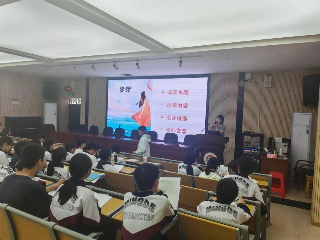 为扎实推进学校心理健康教育工作,高效组织学生参与2026年长沙市、雨花区治愈系心理漫画创作比赛,4月10日中午12时45分,长沙市明德雨花实验中学在躬行楼报告厅一楼召开心理委员专题培训暨赛事动员大会。本次活动由汤晓梅老师主持,高娟老师主讲,全校100名心理委员参会。