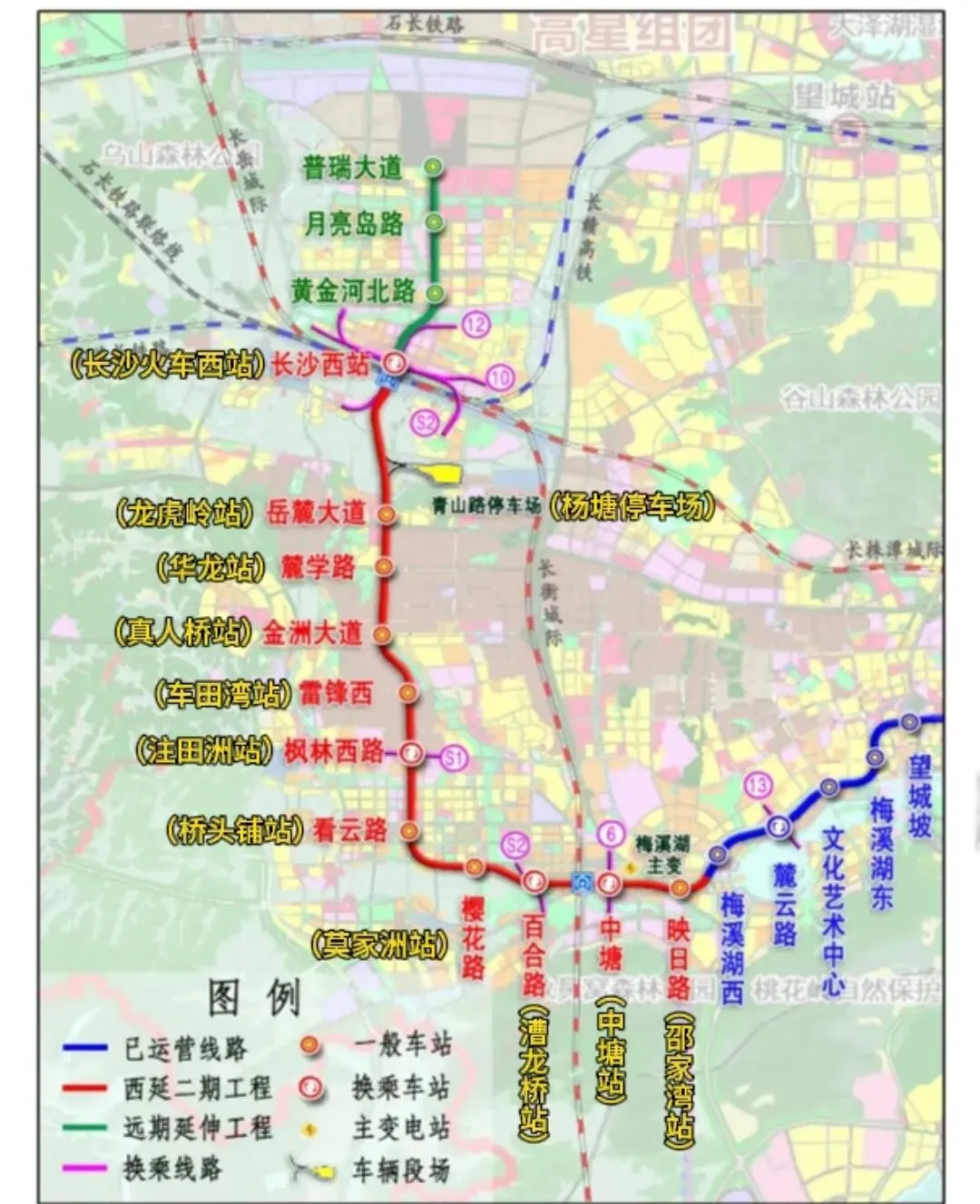 另外一条就是延长到汽车东站的7号线了,在北侧沿远大路铺设线路,设车站8座分别是:东二环、马王堆、汽车东站、望龙路以及4个换乘站点(其余部分还在前期施工中)。另一方面还有一条2号线向南延伸到了华龙站;另外还有6号线增设的龙华站。