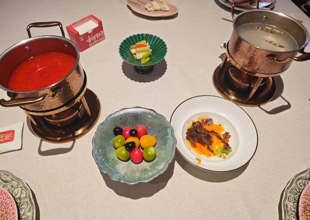 小火锅我吃的酸汤锅,底料一般般,蘸料也很简单,不像专门火锅店那样锅底蘸料丰富,可能旨在吃食物本味,我个人不喜欢。