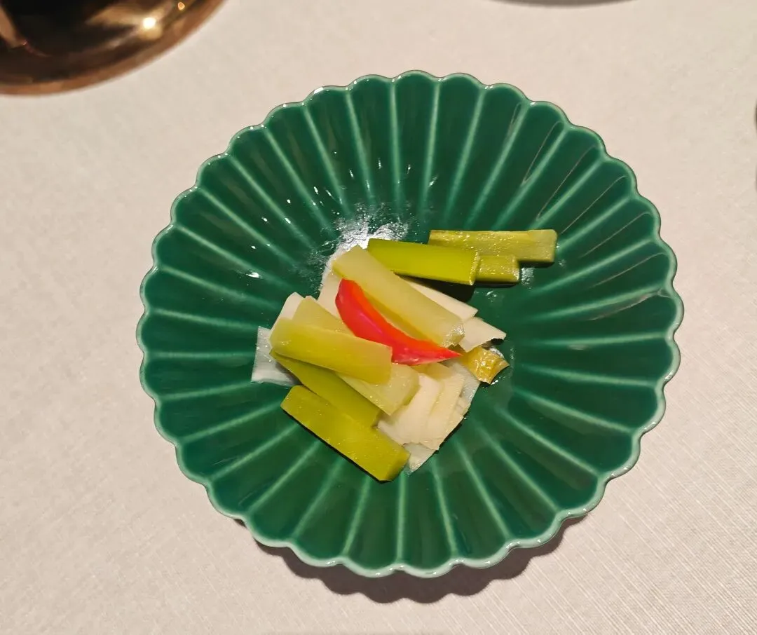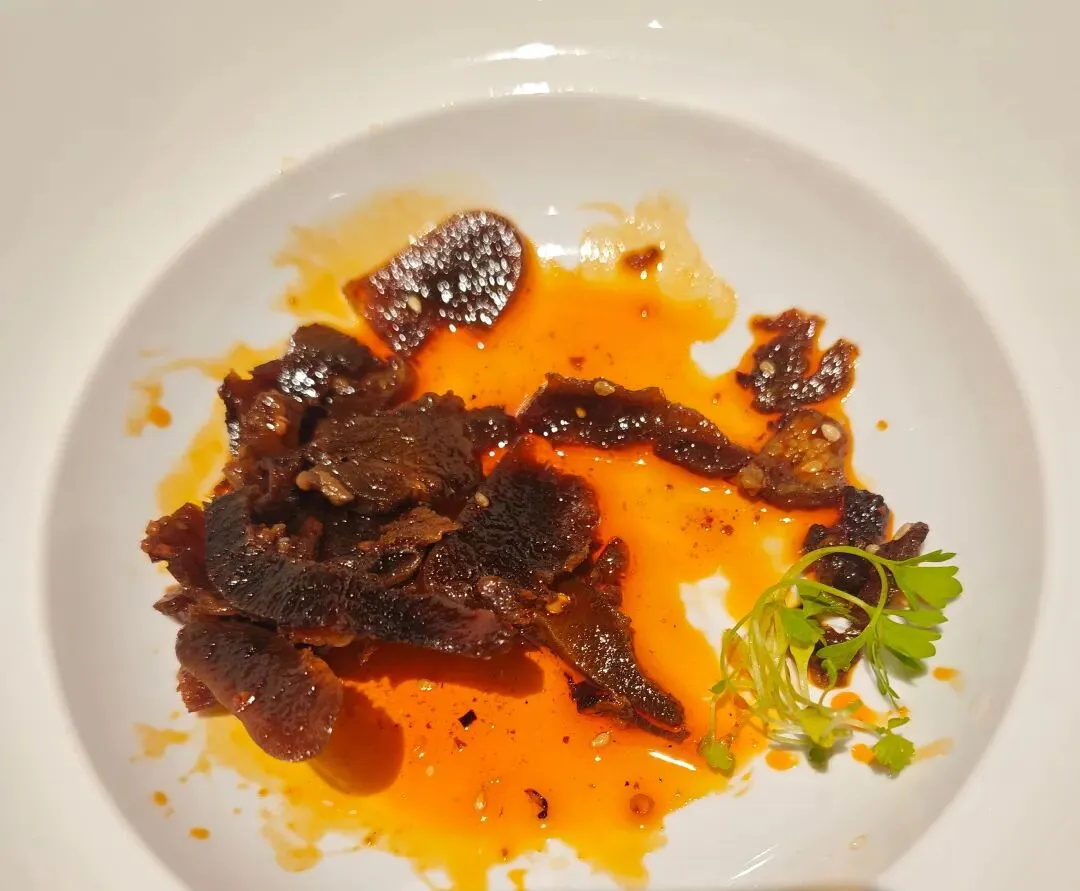 餐前送的水果都很甜,凉菜很好吃,红油卤制,很入味,吃上去有点像牛肉又有点像牛肝菌,结果是卤牛舌,其实我不会主动点牛舌的,但这个凉菜真的做的不错。