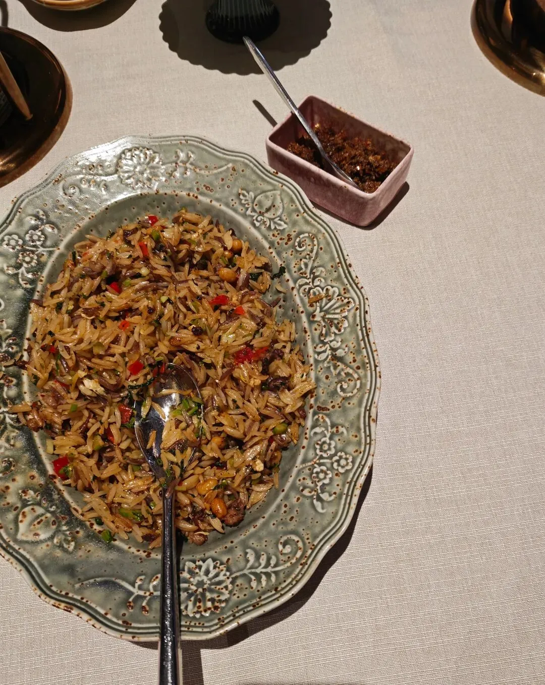 炒饭很实在的份量,48元一份,很多,里面这个米很长一根,我以为是野米,但是野米好像是黑色的,原来是益阳虾稻米,很好吃啊这个米,想把米打包买回家那种,牛肉也想买回家,就是不知道炒着吃如何,烤着吃是一绝的。炒饭送的牛肉酱虽然很多牛肉,但是好咸。。。
