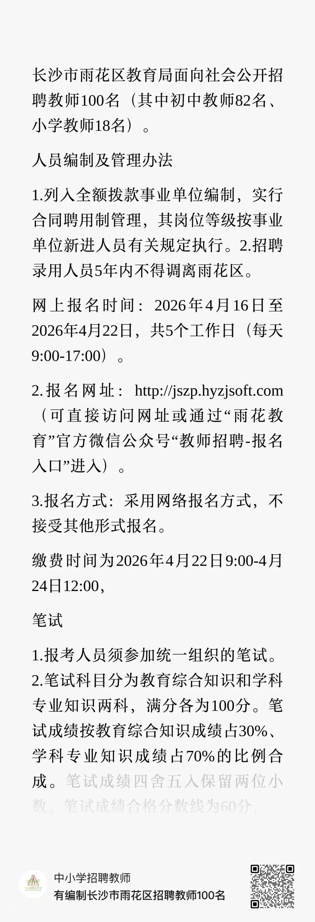 2026年4月14日长沙市雨花区教育局发布面向社会公开招聘教师100名(其中初中教师82名、小学教师18名)。