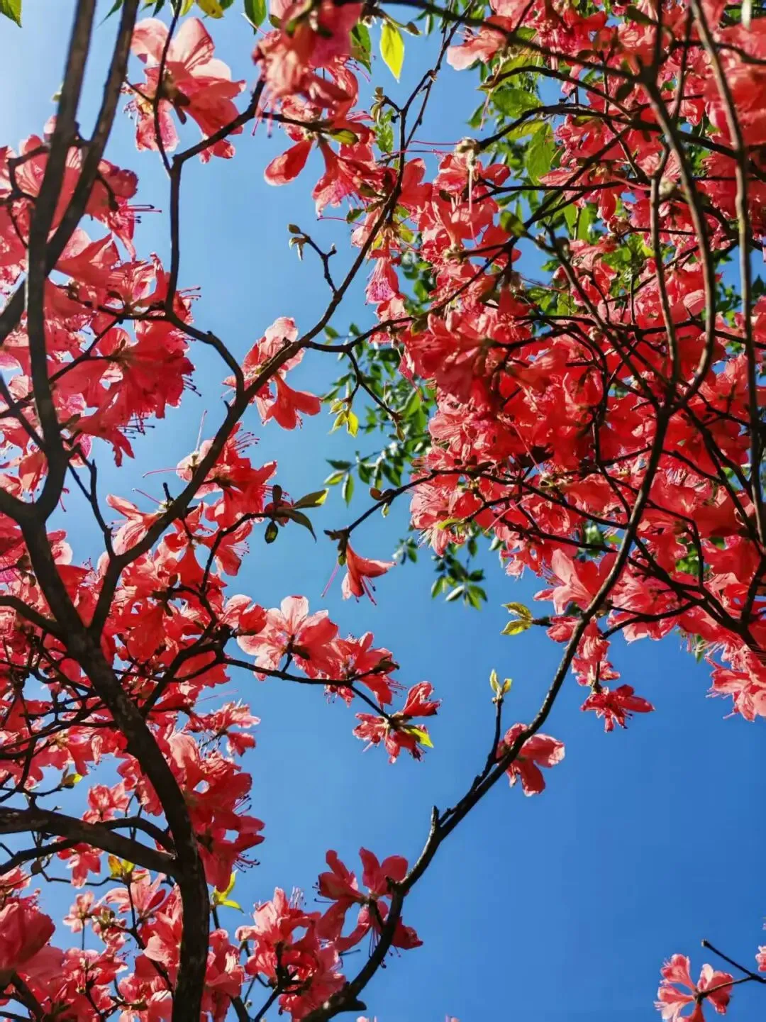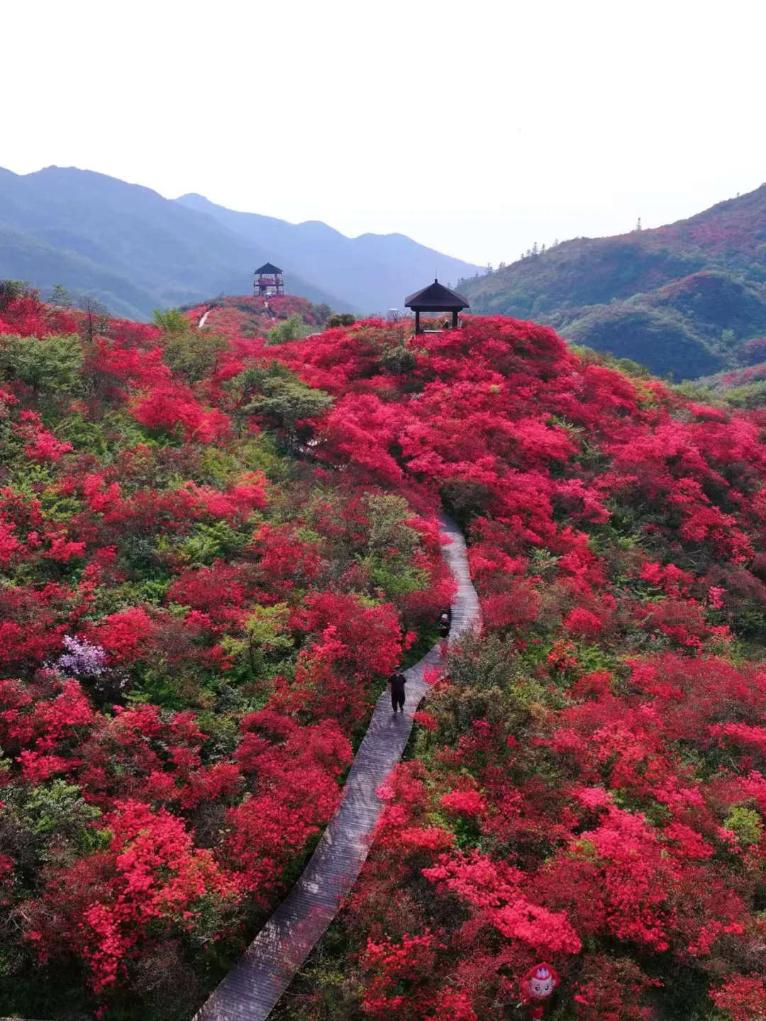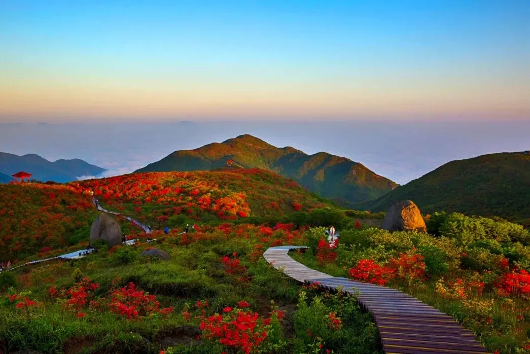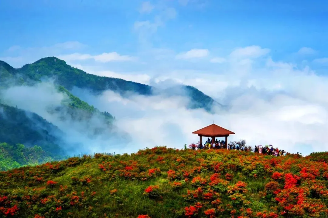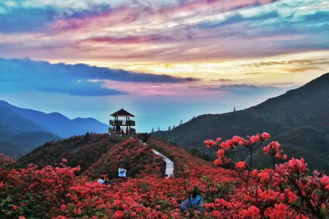 4月底至5月初正值盛花期,登顶观景台,云海与花海交织,风过处花浪翻涌,如置身红色梦境。穿行林间,随手一拍都是大片。