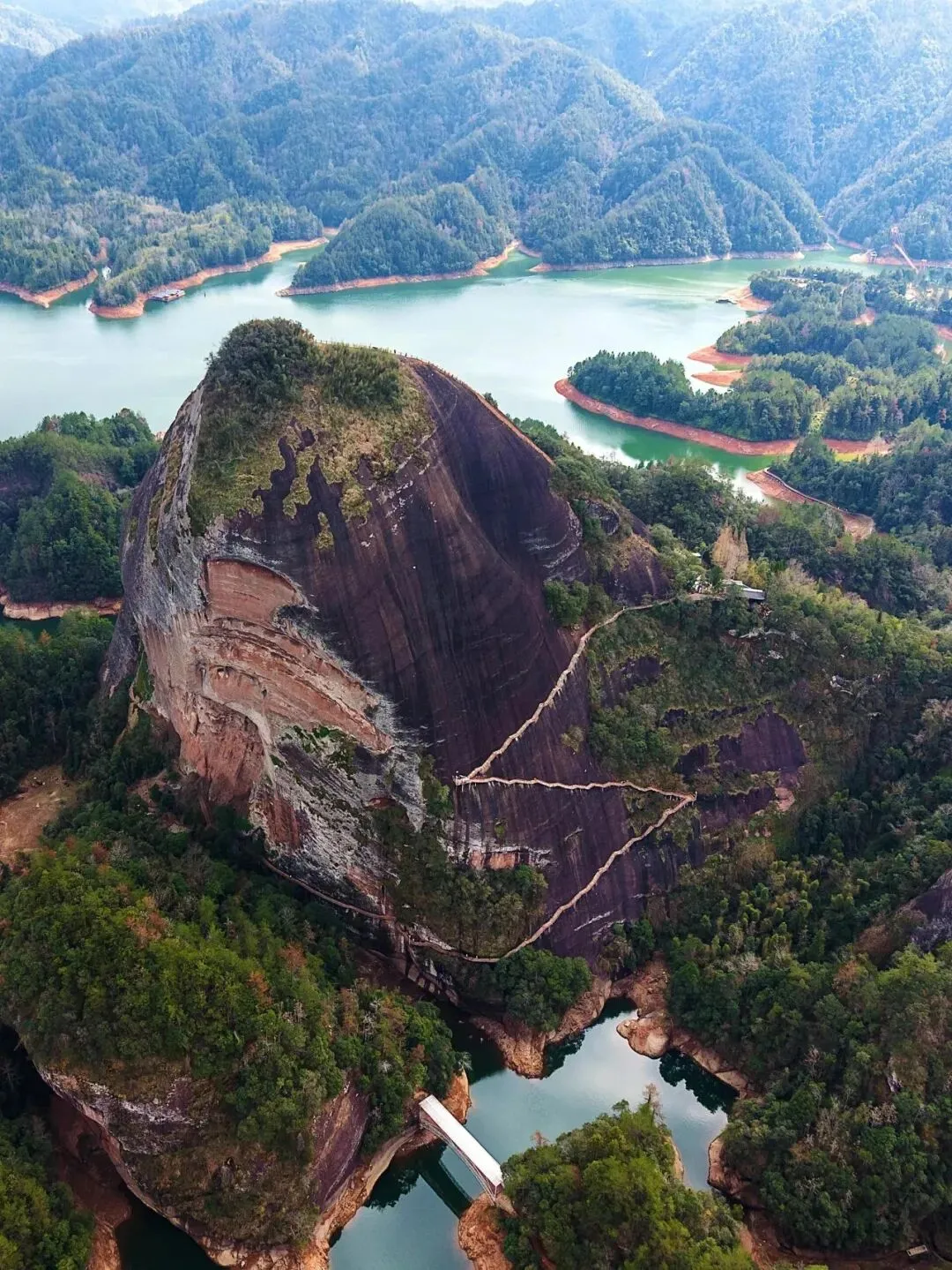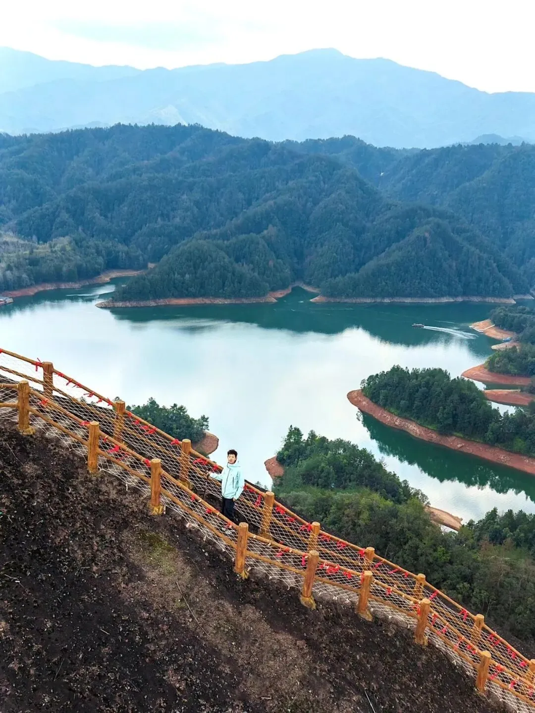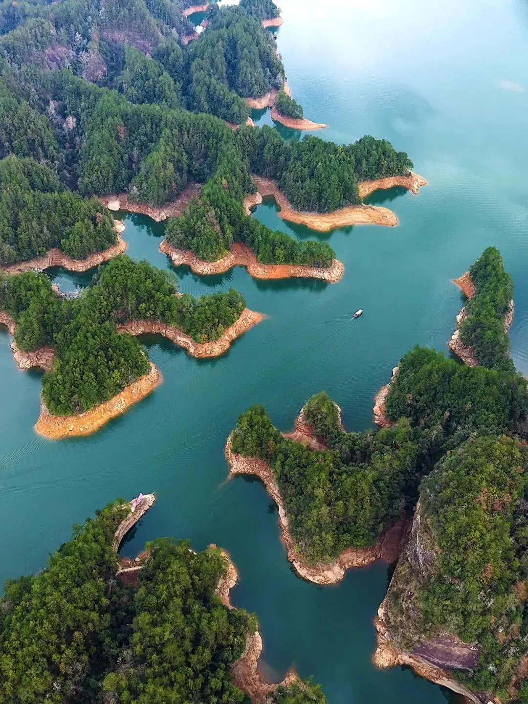 从天柱峰峰顶俯瞰,湖面烟波浩渺,港、湾、湖交叉相错,形似一条巨龙匍匐于群山之中,湖中座座青山如簇簇睡莲,在云雾映衬下,宛如水上迷宫。