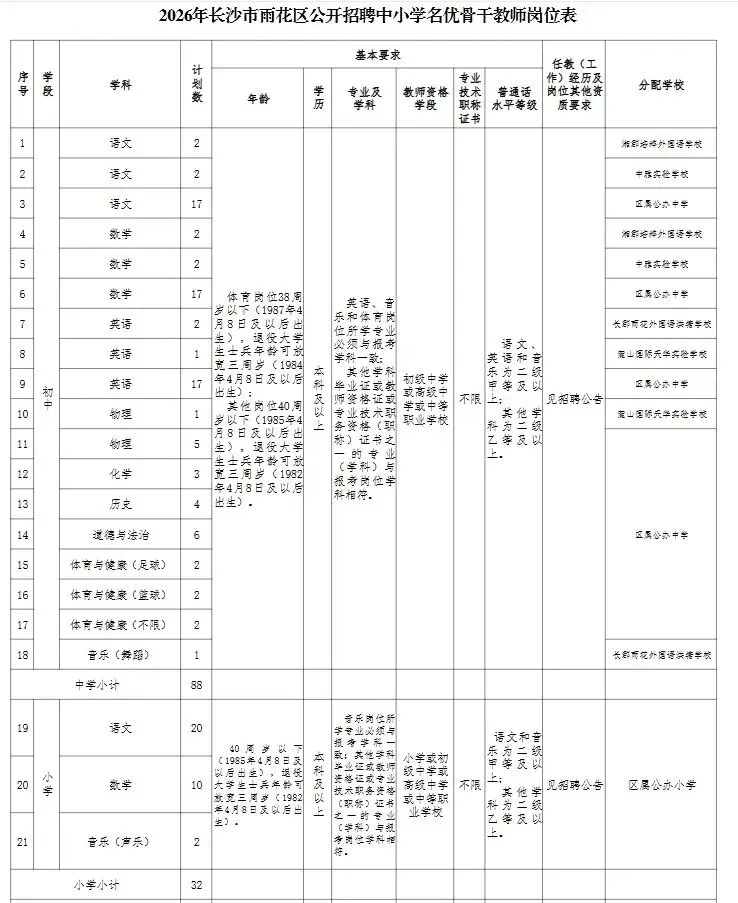 根据《事业单位人事管理条例》(国务院令第652号)、《关于进一步做好事业单位公开招聘工作的通知》(人社部发〔2024〕57号)和《湖南省事业单位公开招聘人员办法》(湘人社规〔2025〕1号)等有关规定,经研究决定,面向社会公开招聘中小学名优骨干教师120名(其中初中教师88名、小学教师32名)。现将有关事项公布如下:面向社会公开招聘中小学名优骨干教师120名(其中初中教师88名、小学教师32名)