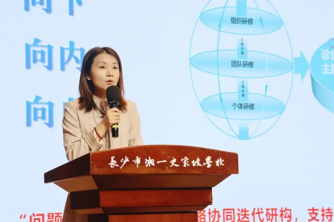 接着,校本研修专题推进会正式召开。吴燕敏校长以《知行合一深耕课堂,校本研修赋能成长》为题作讲话。吴校长结合广州秀雅中学、石家庄十六中实践案例,倡导“先有行、后塑型”理念。她抛出“实施路径是什么、为什么、怎么做”的核心命题,与现场教师互动研讨,引导大家在实践中反思成长。吴校长以念念不忘必有回响寄语全体教师:“一个人走得很快,但一群人可以走得很远。”