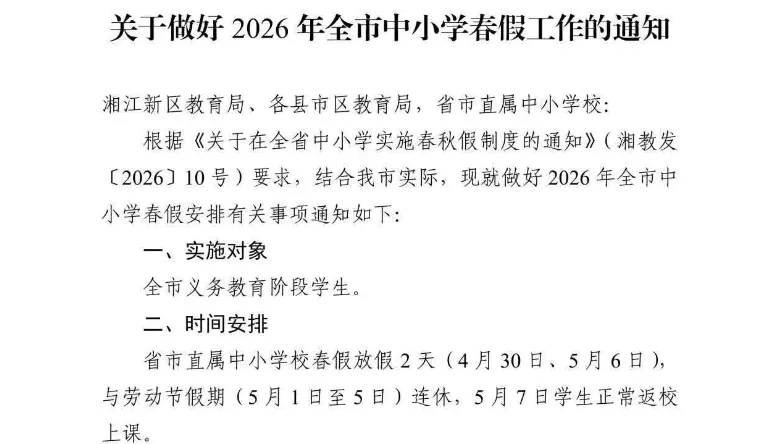 4月初,一则关于长沙春假安排的征求意见稿在网上流传,长沙春假时间计划跟五一假期放在一起。现在定下来了,刚发的通知,长沙中小学春假放假2天(4月30日、5月6日),与劳动节假期(5月1日至5日)连休,5月7日学生正常返校上课。截至目前,整个湖南省除了娄底、益阳的春假时间还没出炉,其他各地州市的时间都定了。