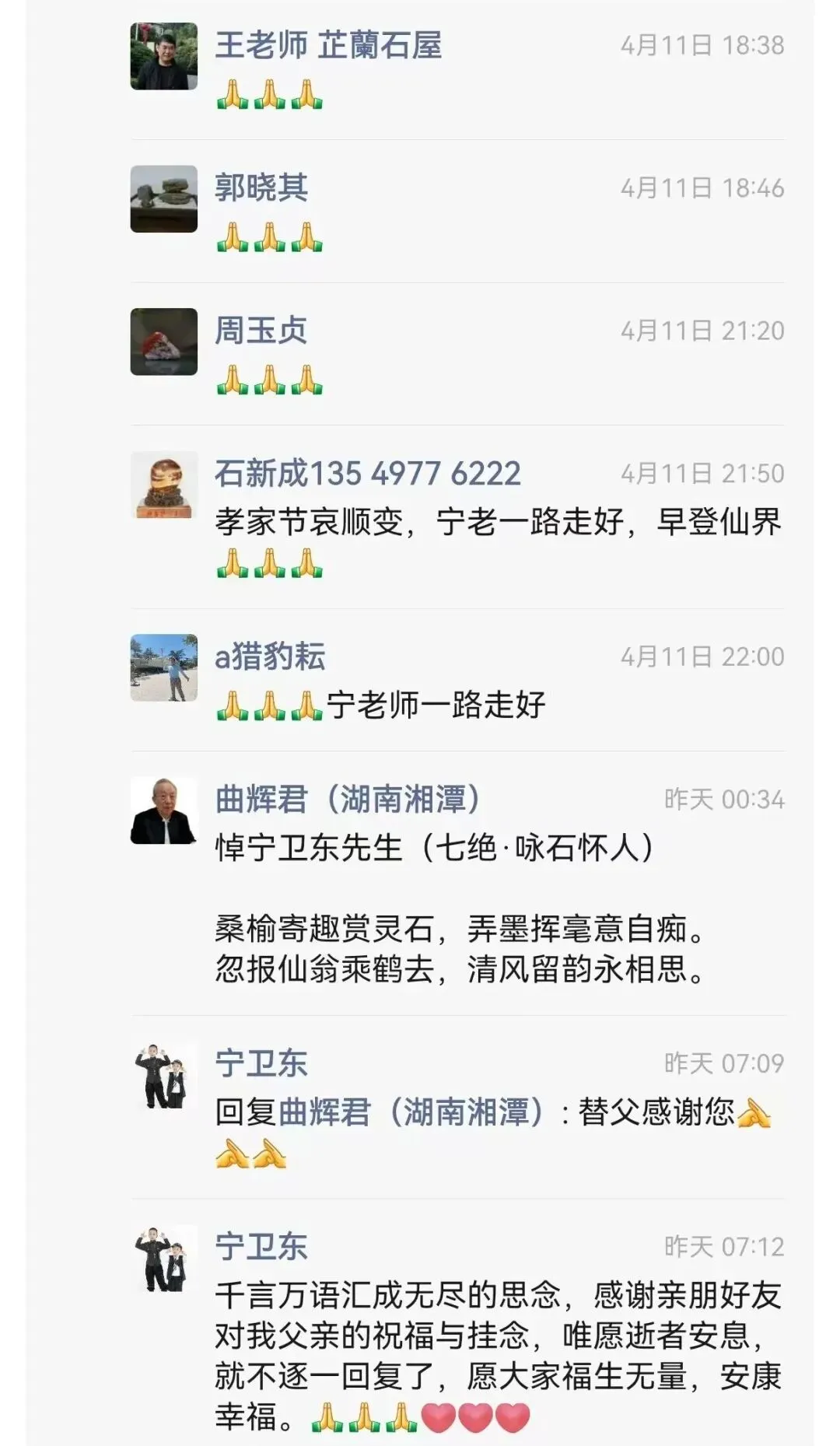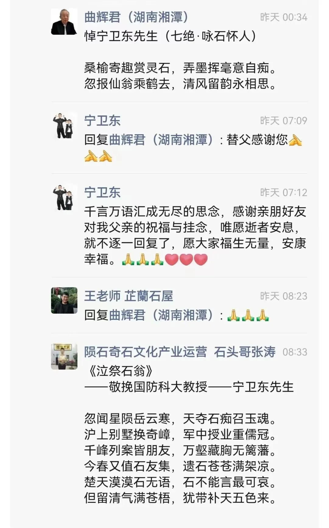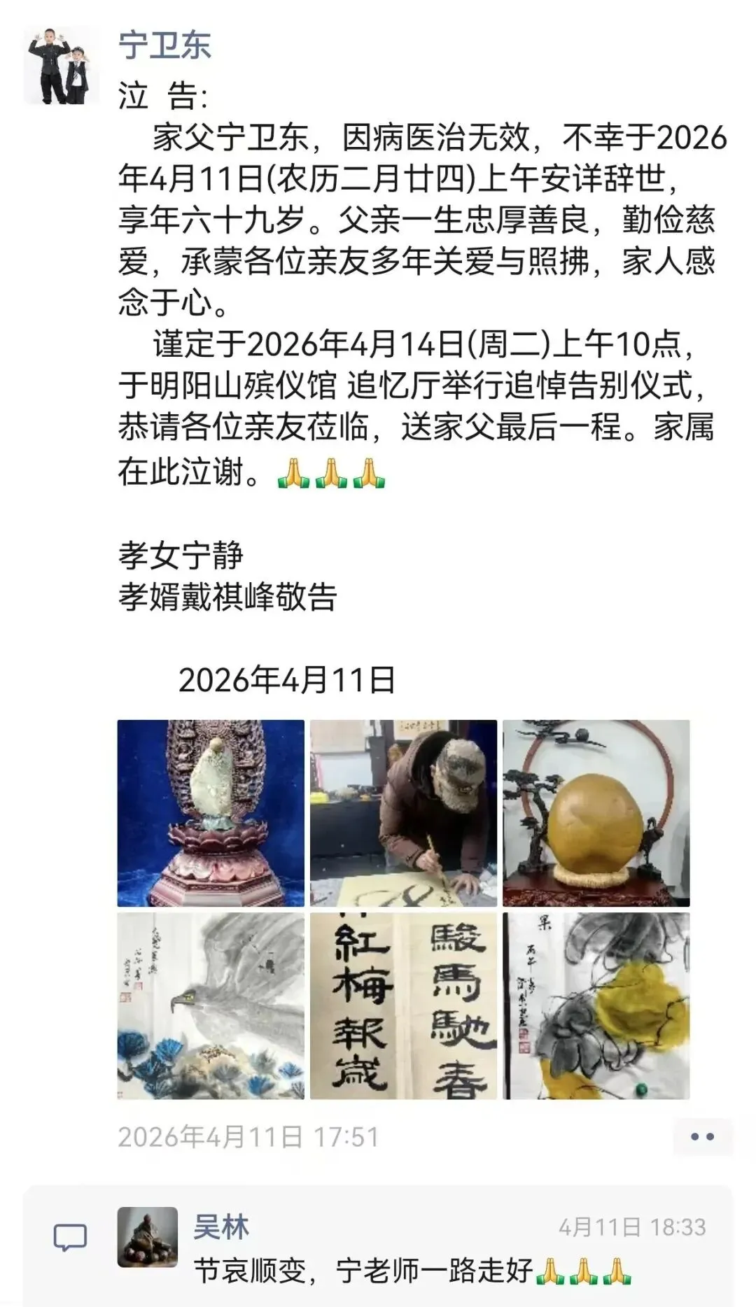 国防科大教授、长沙赏石联盟发起人、宁石轩馆长宁卫东,因病医治无效,不幸于2026年4月11日(农历二月廿四)上午安详辞世,享年六十九岁。宁卫东先生一生追求真理,对党真诚,为国防教育事业贡献一生,闲时不忘追求工笔画艺术,研习字画,领略祖国大好河山,收藏各种奇石异宝,身心愉悦,石友良多。为人忠厚善良,勤俭慈爱,承蒙各位石友兴趣相投,快乐人生,感念于心。
