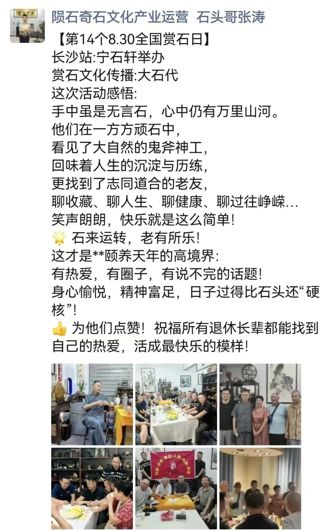 上午一群石友送别宁卫东先生,他的笑容仍在,还在我们身边。记起去年830全国第十四个赏石日在长沙《宁石轩》成功举办。他是发起人,大石代作为承办单位,做好赏石文化的传播与传承。继承宁卫东先生赏石精神,学习做人典范,不断深入弘扬奇石文化。