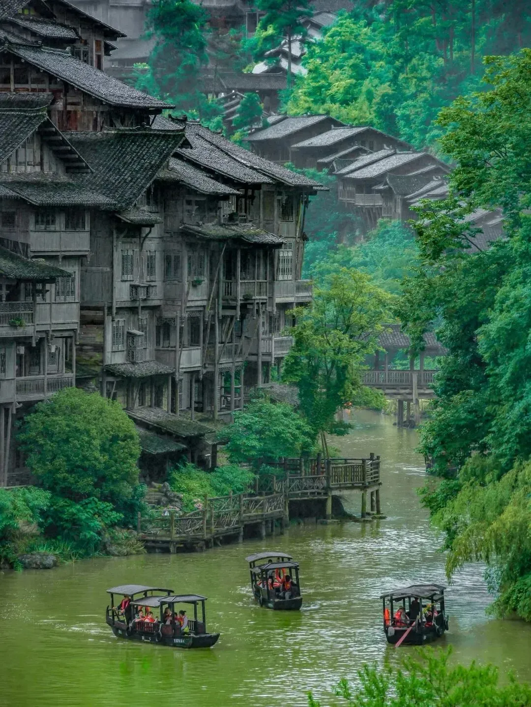 上千栋吊脚楼从山脚一直建到山顶,密密麻麻却又错落有致,像一群挤在一起说悄悄话的老房子。阳光打在青黑色的瓦片上,泛着温柔的光。山脚下是一条碧绿的河,河水安静地流过风雨桥。我当时脑子里只有一个念头:还好我来了。