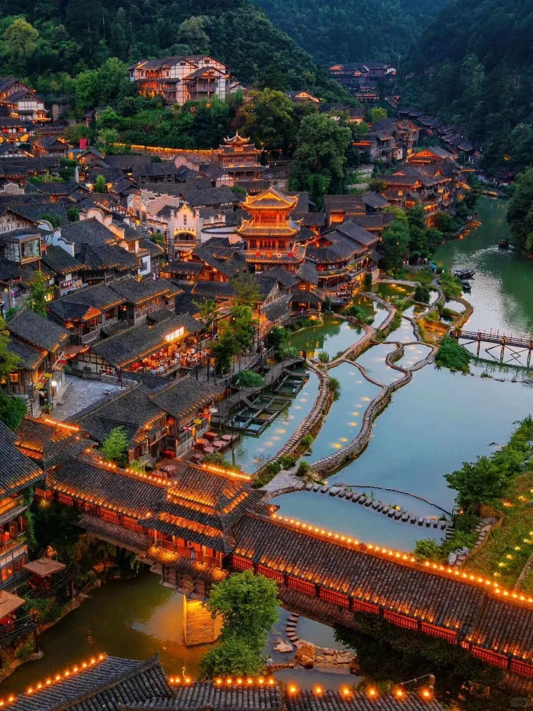 等天彻底黑下来,整个山谷变成了另外一副模样。万家灯火铺满了整片山坡,从山脚一直亮到山顶,密密麻麻,亮亮堂堂。河面上的风雨桥也亮了灯,倒映在水里,风一吹,光影碎成一片一片的。我站在那里看了很久,旁边一个陌生的大姐突然跟我说:“像不像天上的街市?”我拼命点头。
