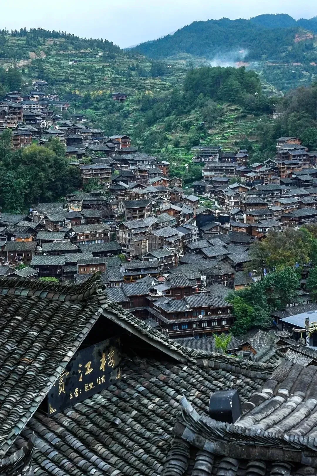 到的时候是下午三点多。从凯里南站坐了一个小时的大巴,一路上全是盘山公路,拐来拐去,我差点晕车。正当我有点烦躁的时候,大巴转过最后一个弯,整片苗寨突然出现在眼前——说实话,那一刻我愣住了。