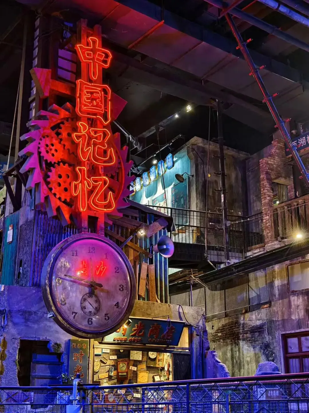 齿轮造型的红色霓虹灯牌——“中国记忆”,下面挂着标有“长沙”字样的复古挂钟,后面的“时光商店”,让我们穿越回80年代长沙的模样。