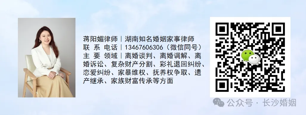 蒋阳媚律师拥有法律硕士学位,并在执业过程中进修了心理学、教育学、企业法等知识。这一知识结构使她处理婚姻家事案件时,不只关注法律关系,也留意当事人的情绪状态与家庭系统的复杂性。据了解,她长期专注于婚姻家事领域,目前担任湖南华蔓律师事务所合伙人。