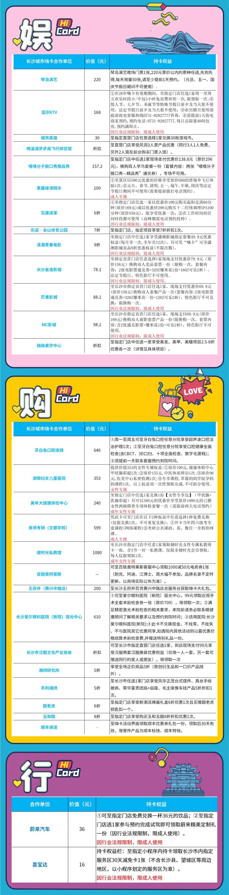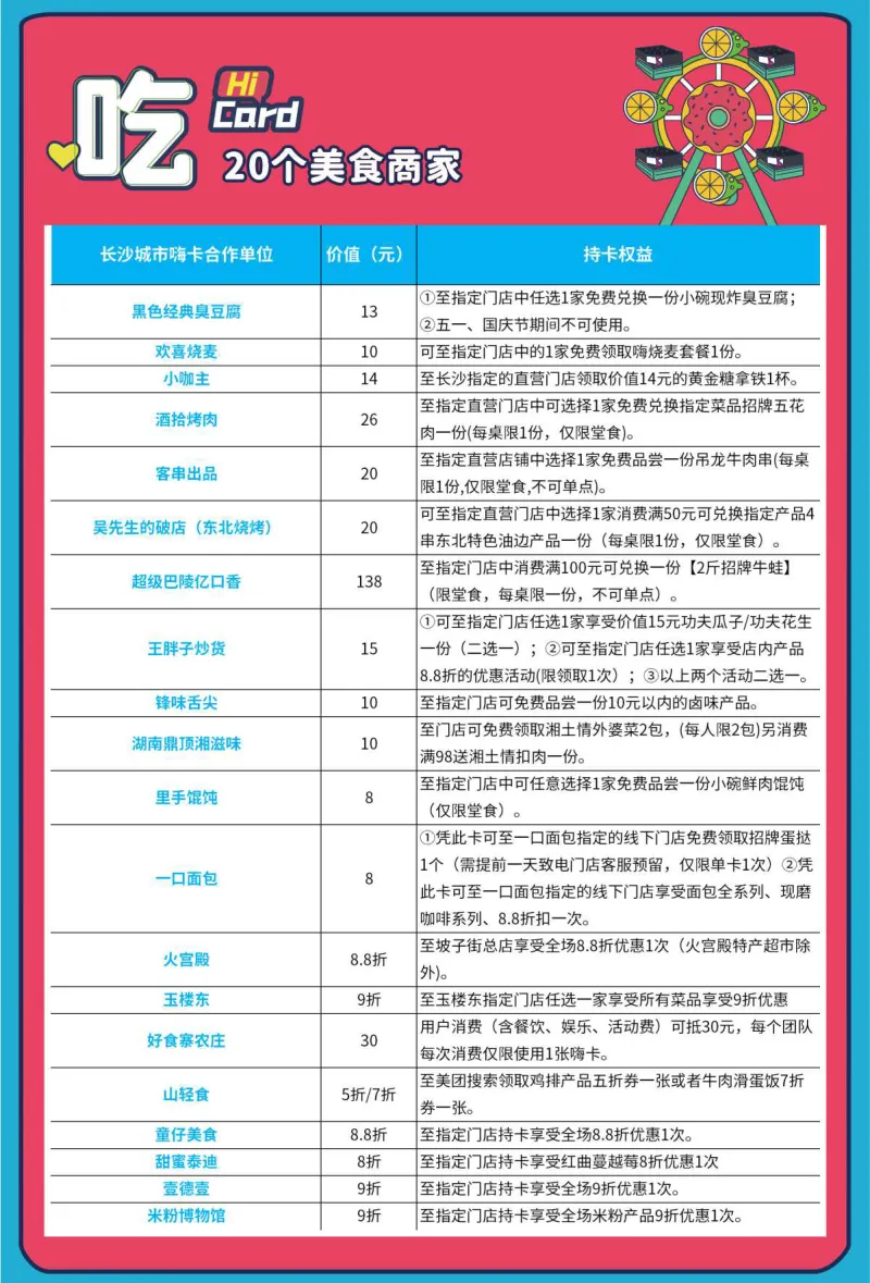 一张”长沙城市嗨卡“包含“吃、行、游、购、娱“5大要素,可享受价值超6000元+的权益覆盖长沙超100+明星商家专享优惠,并且随着品牌商家的不断增加将来可以带来种种不同惊喜。)