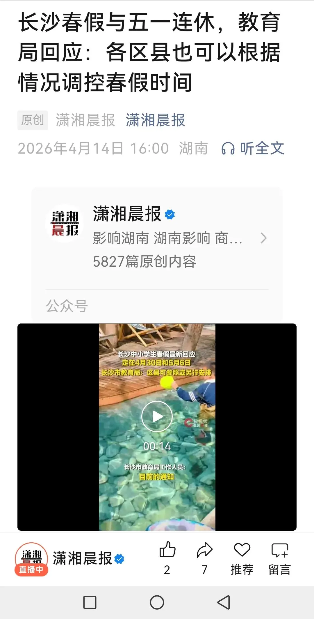 比如潇湘晨报官方公众号在昨天报道,长沙市教育局已发2026年长沙中小学春假通知。
