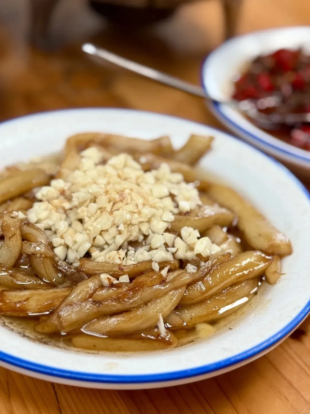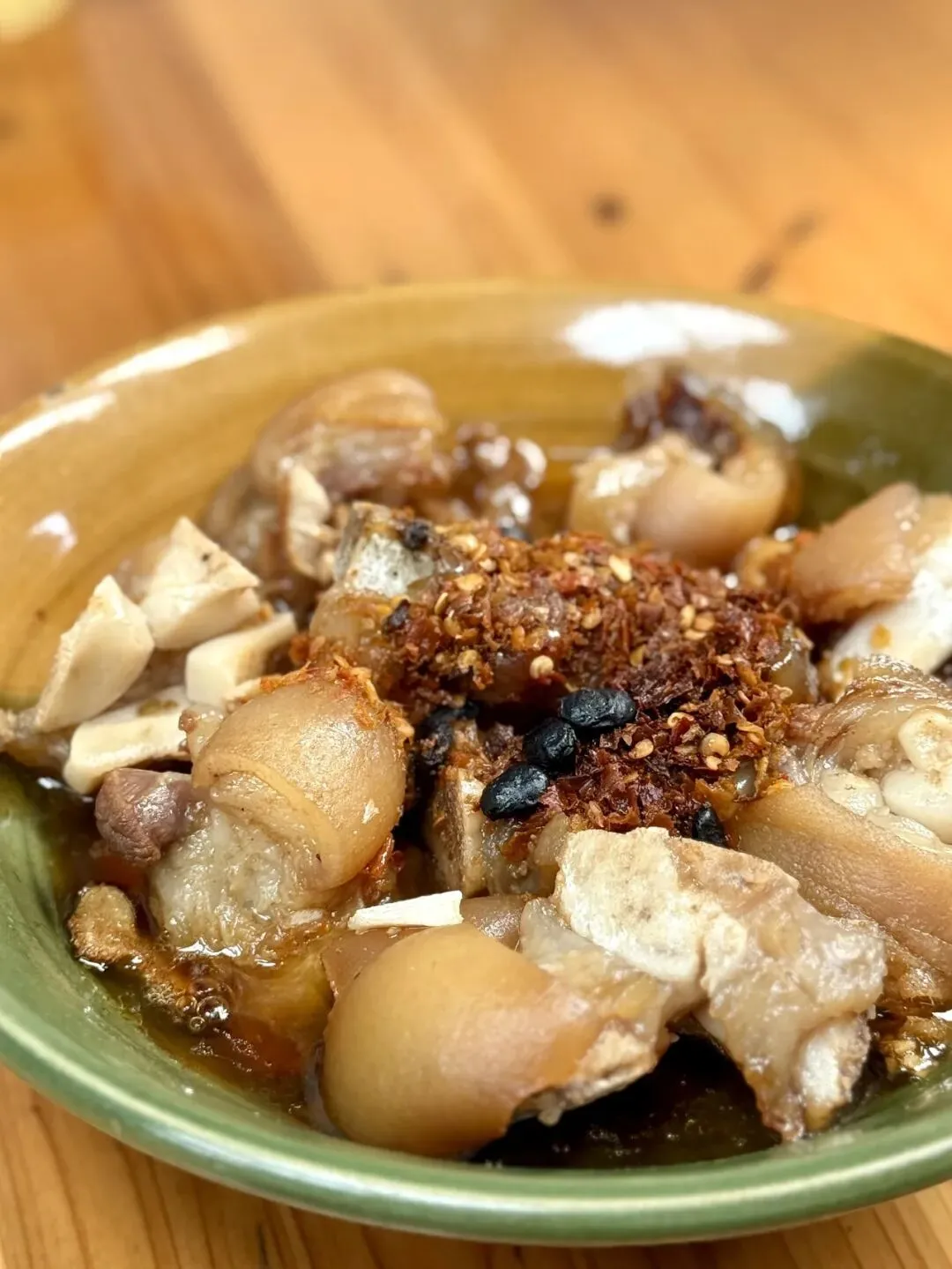 非常清澈的一道菜,颜色不重,一点简单的干辣椒和豆豉在表面上摆放,给不吃辣椒的食客多了一种选择。食材很新鲜,没有一丝猪腥味,部位也不错,都是前掌,没有后腿上的那一大坨肥肉。猪脚蒸得软烂脱骨、胶质饱满,猪皮糯到粘嘴,瘦肉嫩而不柴。辣得通透不燥,豉香入骨,汤汁拌米饭能多干两碗,妥妥的下饭硬菜。第一道菜就可以必点了。