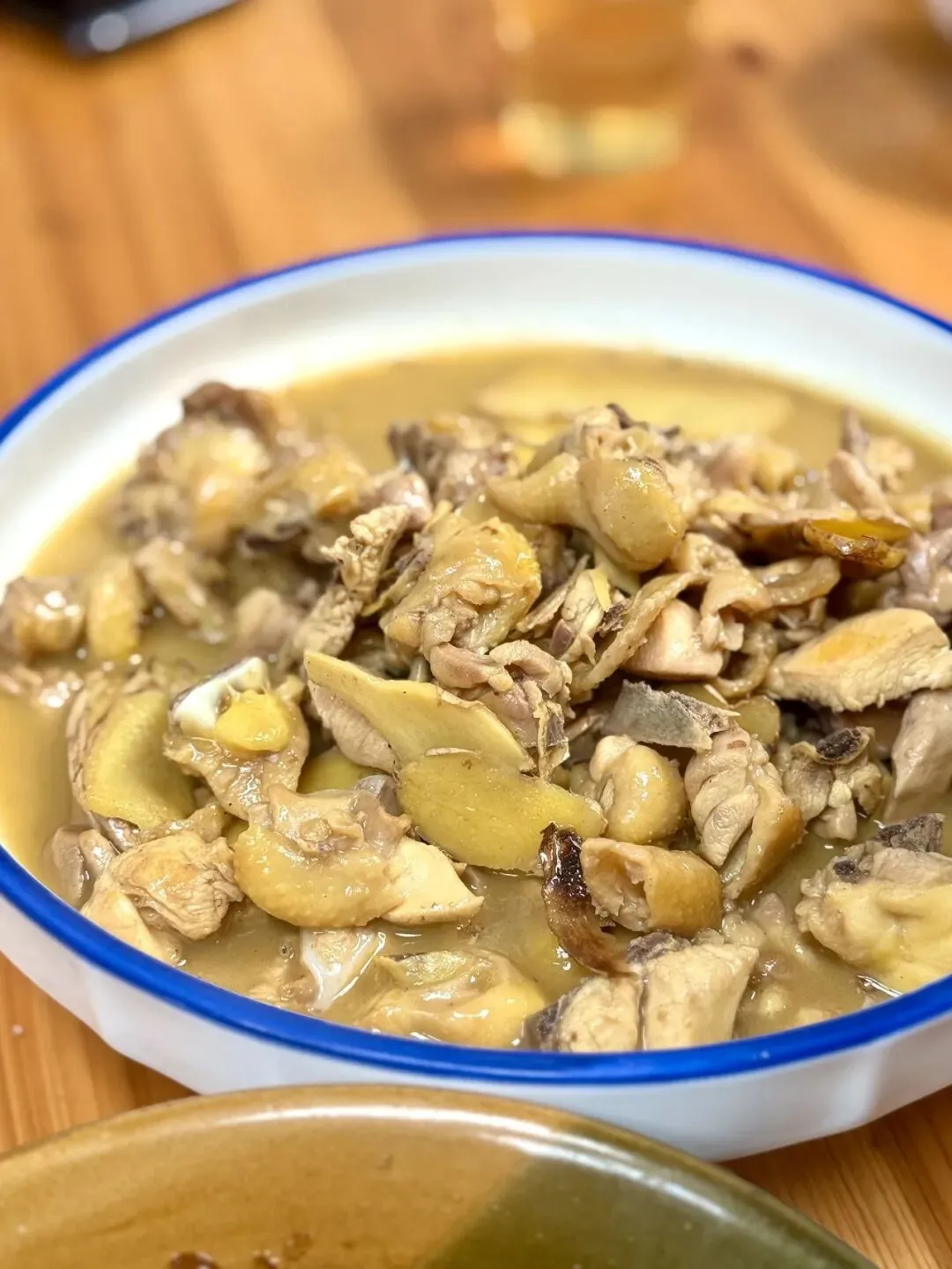 这道菜以上给我们的第一感觉就是浓郁,汤汁的浓郁。鸡的油脂被大火和滚水乳化,产生了一种水乳交融的感觉。试一口首先感受到的就是浓郁的姜香,证明老姜煸炒出了姜油,很是到位,辛香醇厚不呛喉,放了些米酒提香去腥,用的仔鸡慢煨至脱骨软糯,紧实不柴,每一丝肉都吸满姜酒鲜汁,虽不试土鸡,但鸡味依然比较足,还算是好货。汤汁金黄油亮、浓稠挂汁,鲜辛回甘,是米饭 “杀手”,拌一碗香到舔盘。必点!