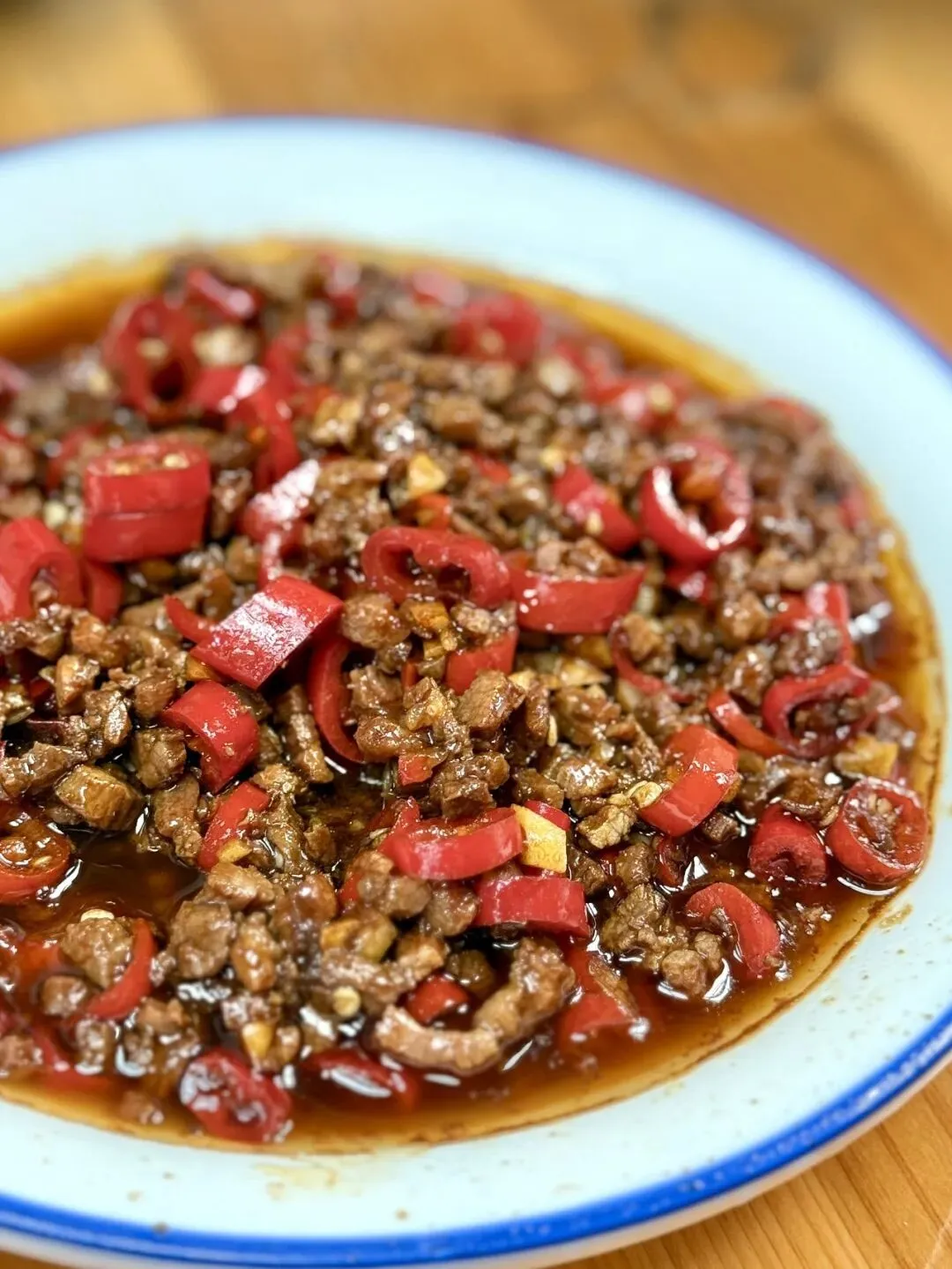 店家的招牌菜,现点现切。你没有看错,这道碎碎牛肉是现切出来的,甚至不是剁。在忙不过来的时候老板会拒绝做这道菜,因为实在费功夫。新鲜的牛肉粒经过大火快炒,又只用了简单的辣椒和蒜子来提味,牛肉味表现得很好,这道菜的做法就是为了拌饭而生的菜,必点!
