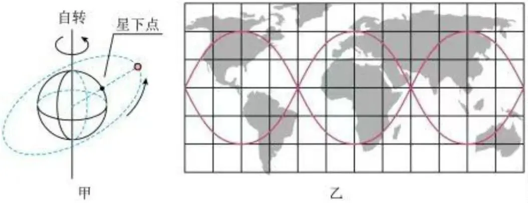 4.如图甲,“星下点”是指卫星和地心连线与地球表面的交点,图乙是航天控制中心大屏幕上显