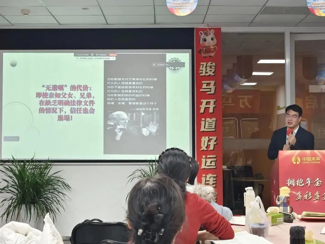 2026年1月27日,北京德恒(长沙)律师事务所高级合伙人徐志群律师受邀前往中国太平人寿保险有限公司湖南分公司,开展题为《财富传承的守夜人:保险的法律价值与智慧传承》的专题培训。本次培训旨在深入解析保险在财富传承中的法律功能与实务应用,助力保险从业者提升专业服务水平,为客户提供更精准、更安全的财富规划方案。