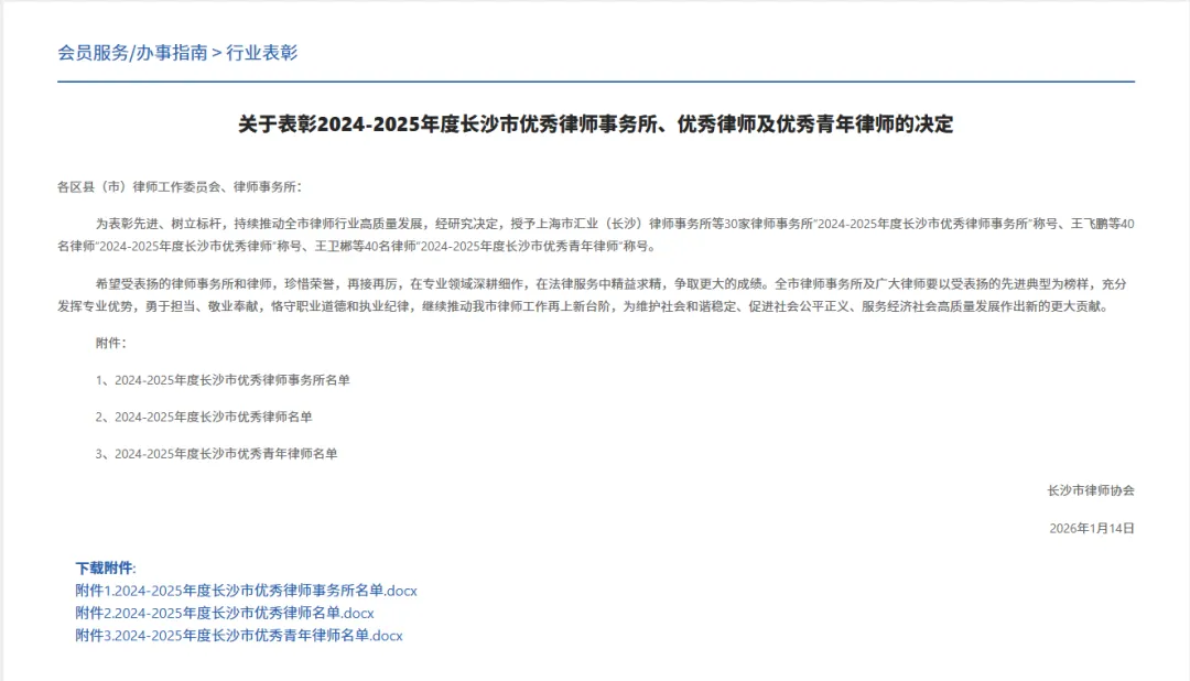 为表彰先进、树立标杆,持续推动全市律师行业高质量发展。2026年1月14日,长沙市律师协会发布了《关于表彰2024-2025年度长沙市优秀律师事务所、优秀律师及优秀青年律师的决定》和《关于表彰2024-2025年度长沙市律师事务所行政管理先进个人的决定》,我所高级合伙人、执行主任毛劲松被评为长沙市优秀律师;一级合伙人、第二党支部书记胡栋被评为长沙市优秀青年律师;行政主管罗新枝被评为长沙市律师事务所行政管理先进个人。