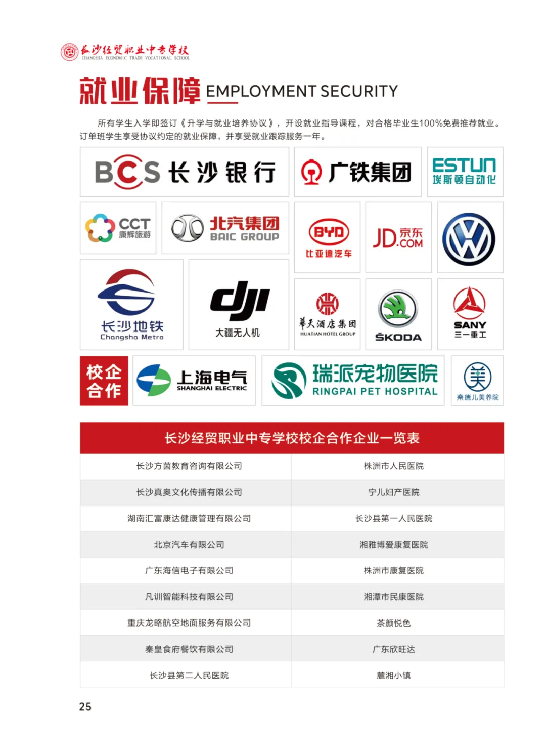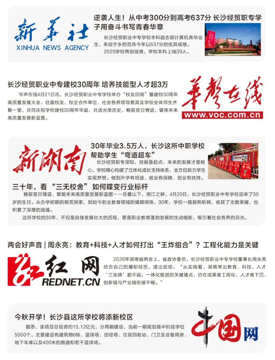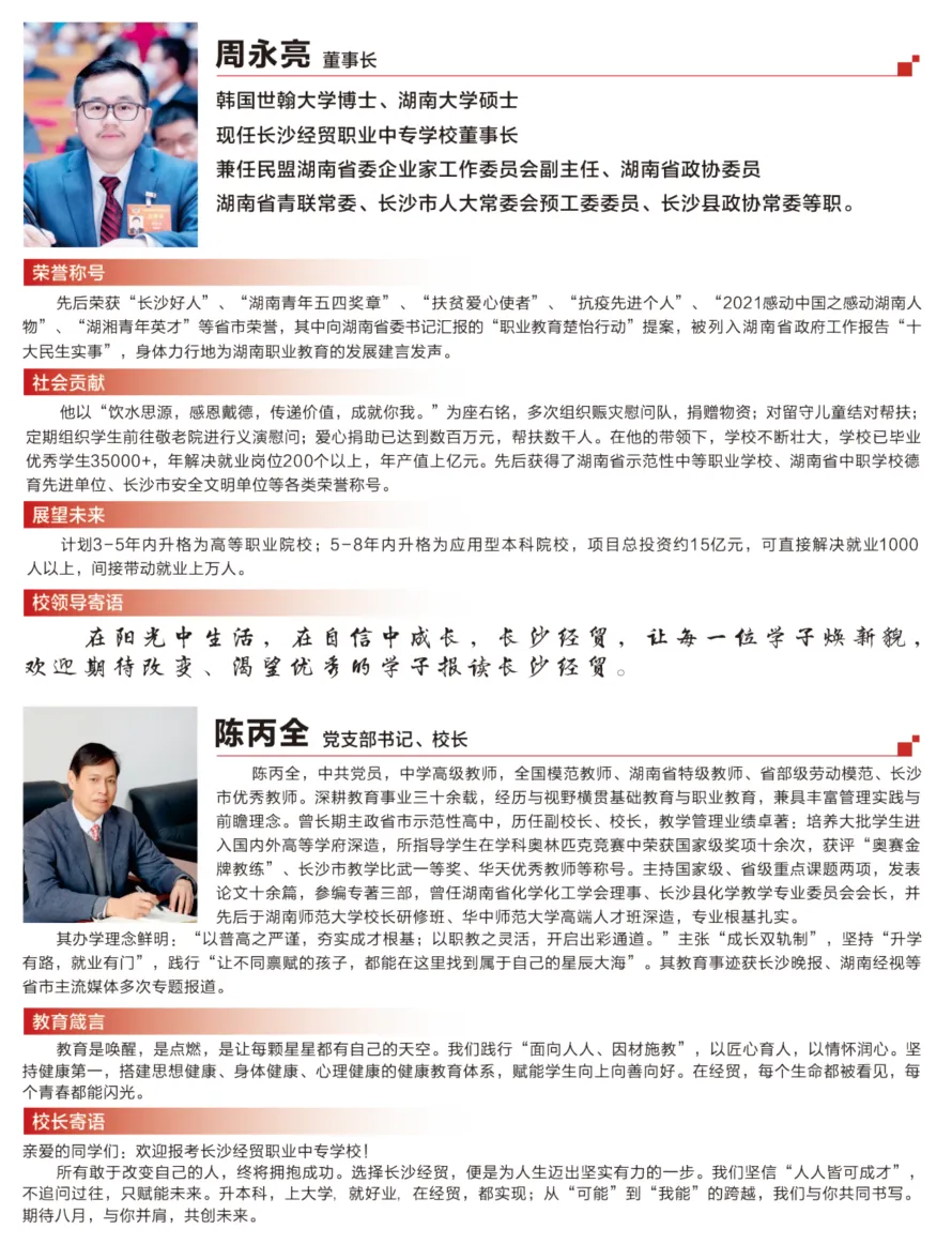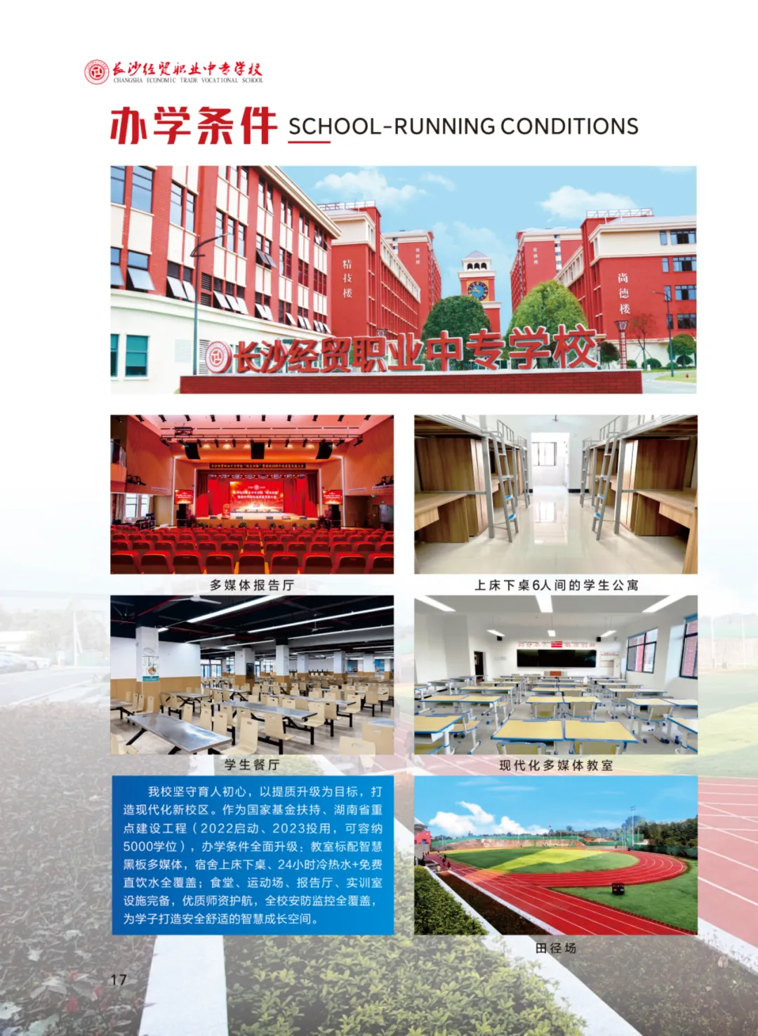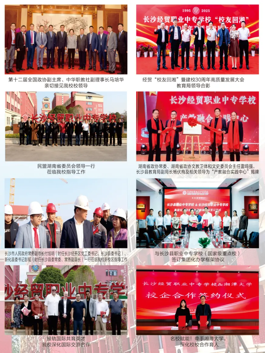 长沙经贸职业中专学校是经长沙市教育局批准、湖南省教育厅备案的一所全日制中等职业学校。学校由公办学校改制,创办于1995年,至今已有31年的办学历史,办学成果丰富,师资强大。学校开设以计算机应用、新能源汽车、电子电器、人工智能、无人机操控与维修为核心的智能制造专业群,以护理、康复技术专业为核心的医卫专业群,以城市轨道交通运营服务及航空服务专业为核心的现代交通服务专业群,以及宠物养护与经营、烹饪、美容美体艺术等特色专业。学校与市内园区多家企业开展校企合作,订单式培养高端技能人才,自办学以来为长沙培养各类高端技能人才近3万人,是湖南省中职学校标准化建设首批