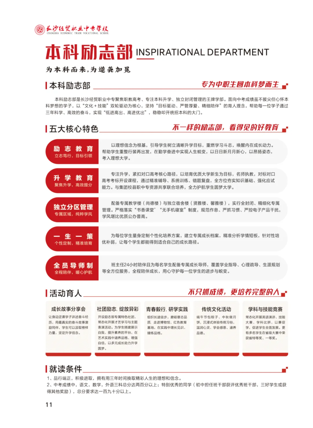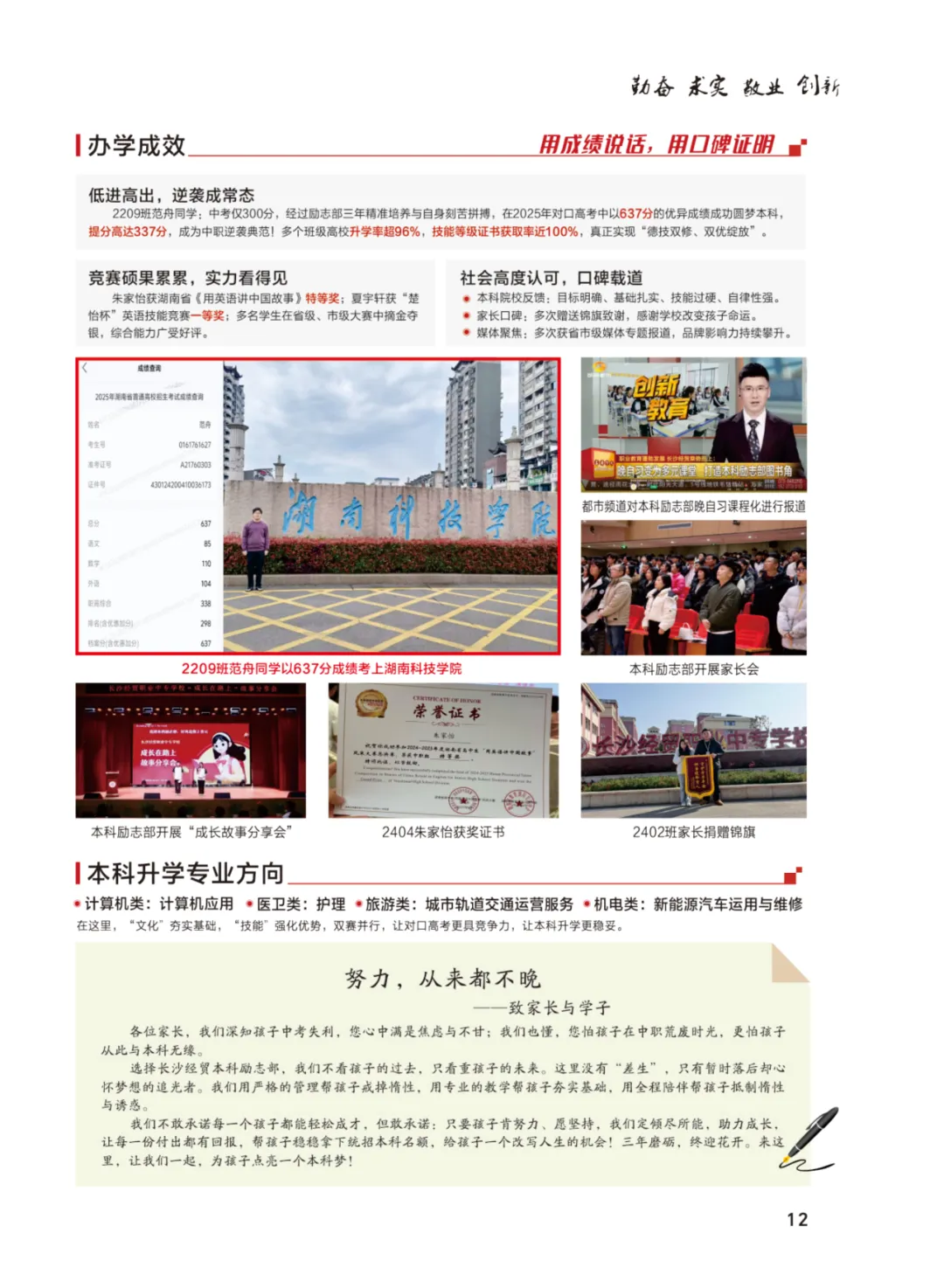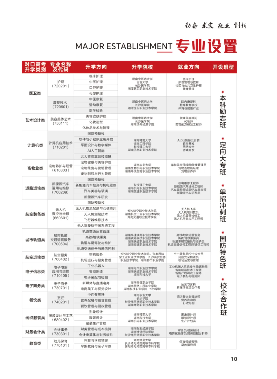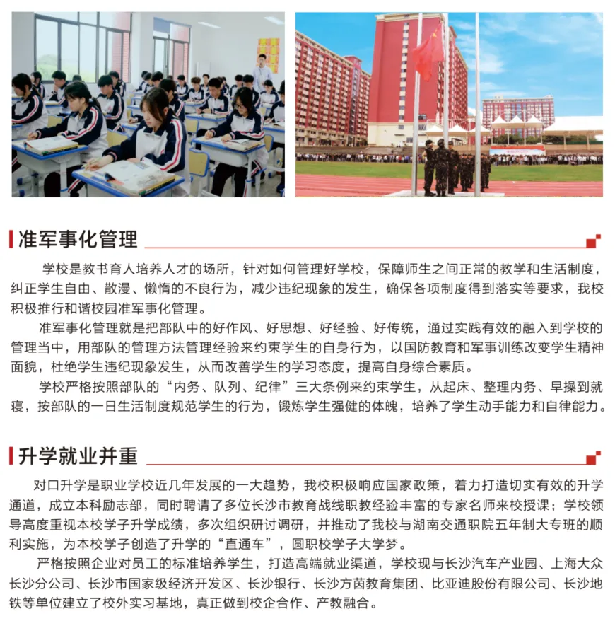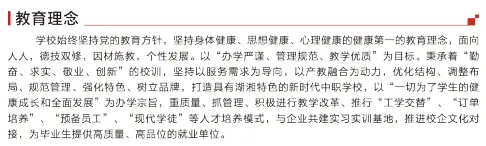 学校坚持学生第一,践行一切为了学生、为了学生的一切,实施3+2及中高职本科贯通、升学与就业并重的培养模式,实施“五好教育”工程,倾力打造家长满意、学生满意、教师满意、杜会满意、党和政府满意的五满意学校。学校开设本科励志班、单招升学班、3+2中高职贯通班、产教融合就业班,搭建多元成才通道,并与县内优质公办职业中专集团化办学、共享优质资源,立足“服务长沙、辐射区域、对接国际”定位,全力建设五大特色示范校,力争“十五五”期间升格为高职本科院校。
