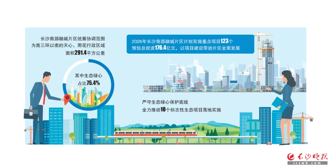 长沙南部融城片区占据长株潭都市圈几何中心,统筹南三环以南的天心、雨花行政区域,面积291.4平方公里,其中生态绿心占比高达75.4%。以2029年第十六届全运会为契机,片区今年计划实施重点项目123个,预估总投资176.4亿元,着力擘画“山水洲城”现代化新画卷。