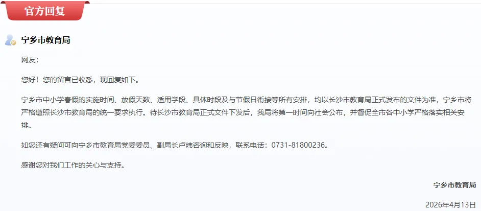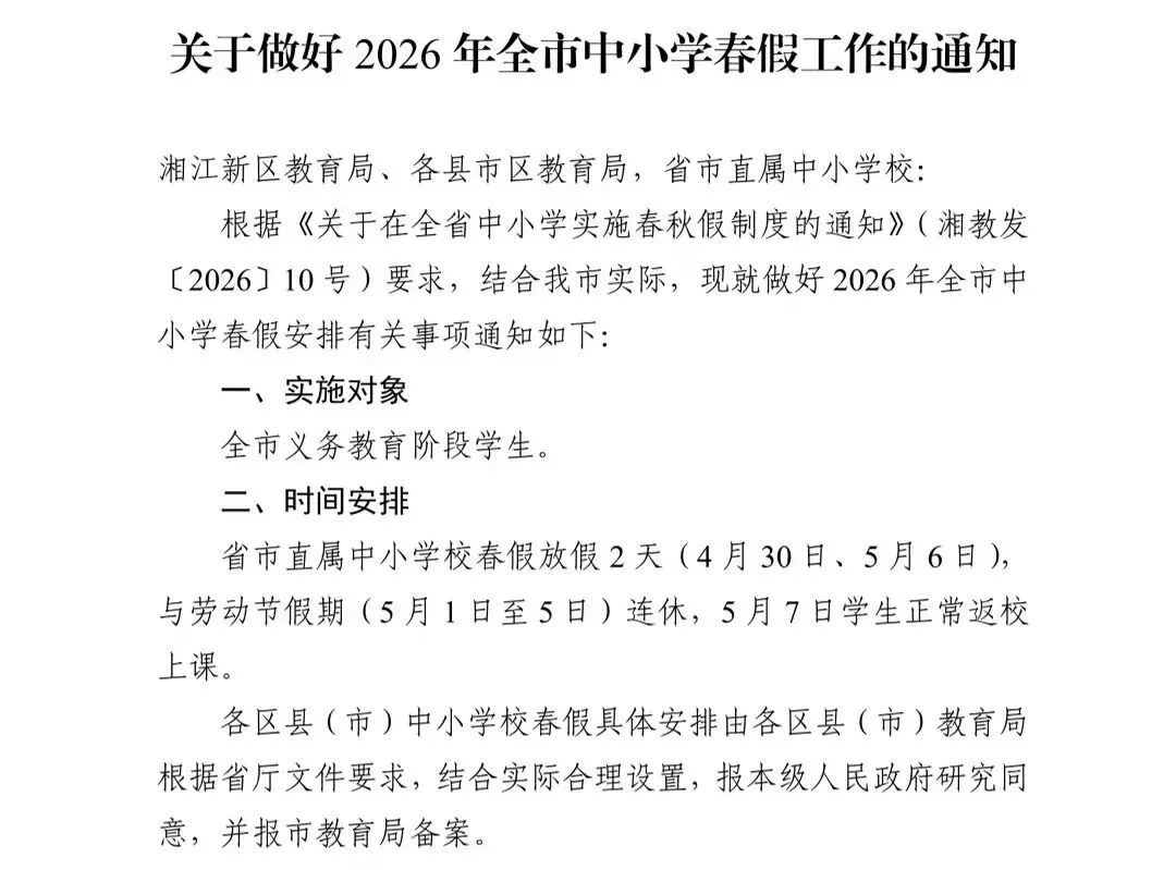 各区县(市)中小学校春假具体安排由各区县(市)教育局根据省厅文件要求,结合实际合理设置,报本级人民政府研究同意,并报长沙市教育局备案。