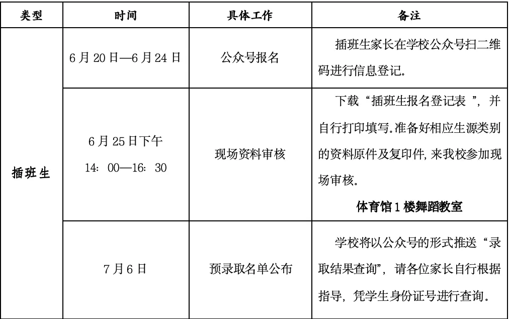 公众号报名结束后,家长扫描下方二维码下载“插班生报名登记表”,并自行打印填写。参考一年级新生报名材料,准备好相应生源类别的资料原件及复印件,到我校体育馆1楼舞蹈教室参加现场审核。