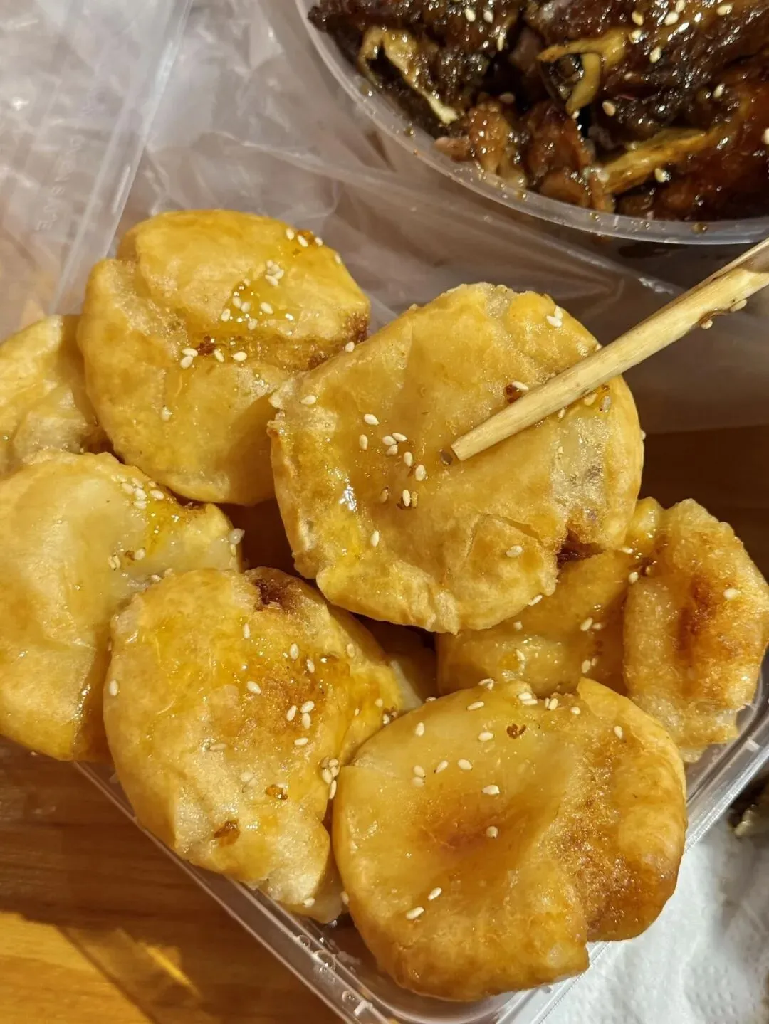 但是!我现在日思夜想的,就是这个圆不溜秋黄灿灿的小东西啊!朋友说它叫扁粑?我搜了好几天,网上的扁粑都长不一样啊,咋我的这个是煎得香香的,表面刷了亮晶晶的糖浆,还撒了白芝麻,油乎乎的看着就馋。