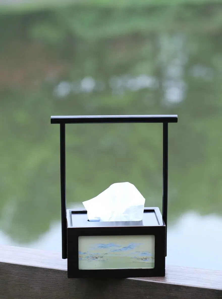 千里江山图纸巾盒,以独有针法,挑绿丝线,将春日山林的苍翠绣得立体可感,仿佛能闻见草木清香、感知春风轻拂。