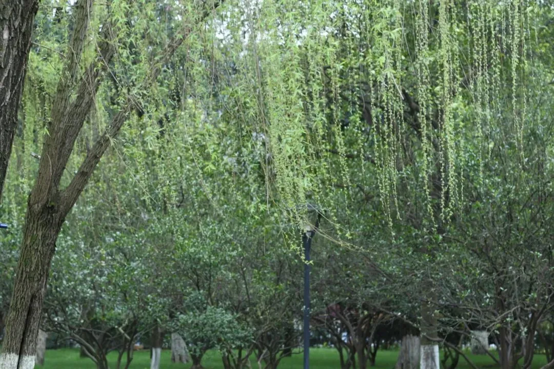 江边垂柳依依,柳芽缀满枝条,风拂柳丝轻扬,如少女垂眸,温婉雅致,恰如旗袍盘扣的灵动,蕴含东方女子的温婉与技艺的精巧。