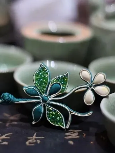 布条经盘绕编抽,化作蝶舞梅开的吉祥盘扣。如今这抹春绿,不仅点亮旗袍衣襟,更化作胸针、摆件融入日常,每一枚盘扣,都是非遗与春天的相拥。