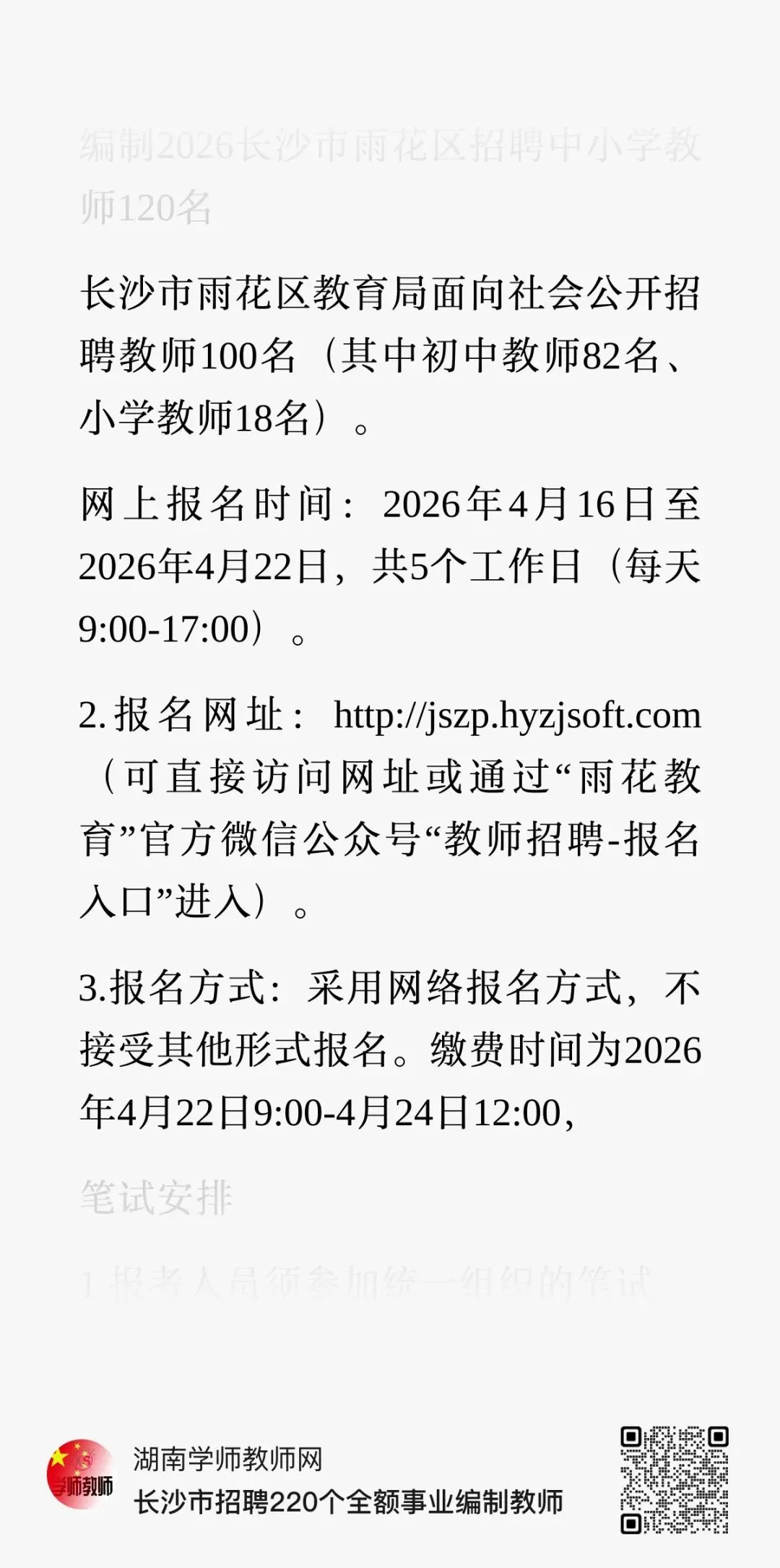 长沙市雨花区教育局面向社会公开招聘教师100名(其中初中教师82名、小学教师18名)。