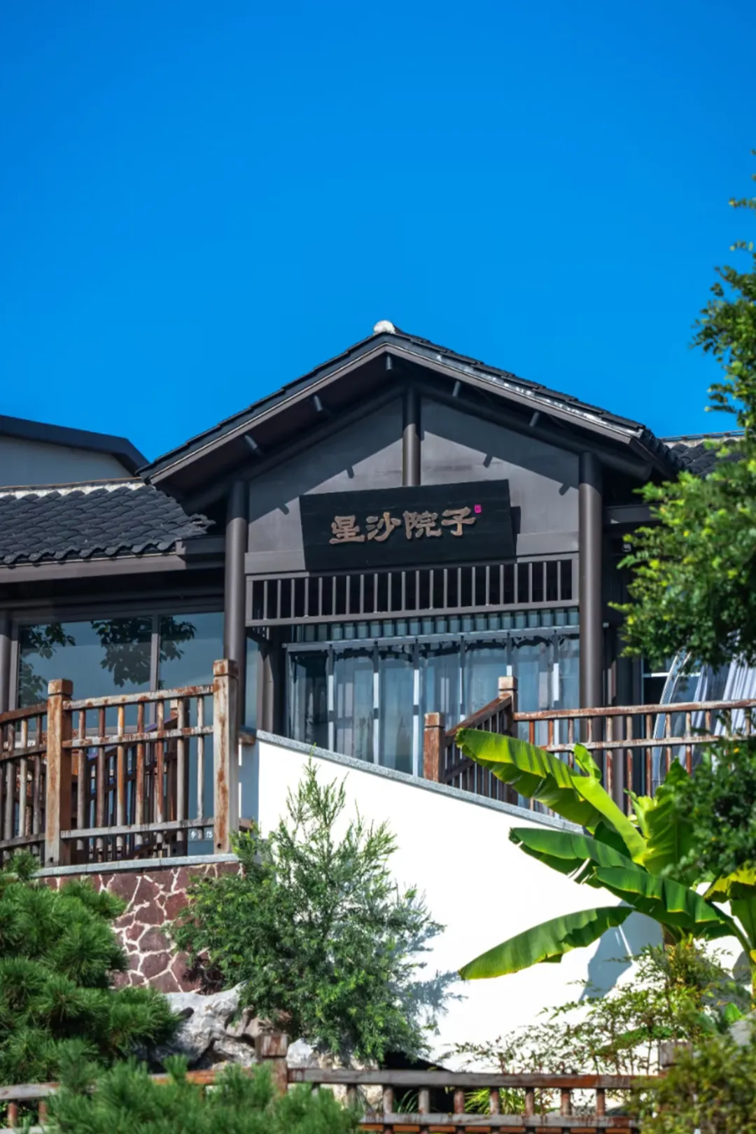 一家庭院式餐厅,典雅的新中式庭院风格设计,绿植环绕,韵味十足。