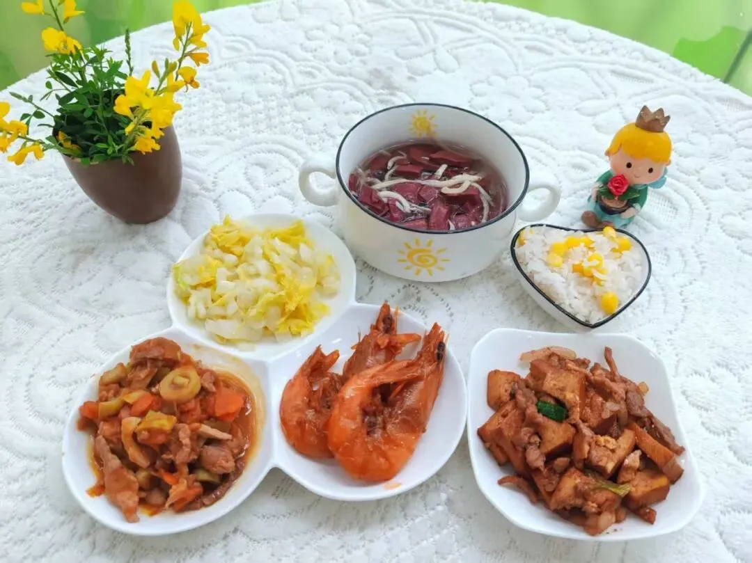 玉米饭 茄汁大虾 猪肉炒香干