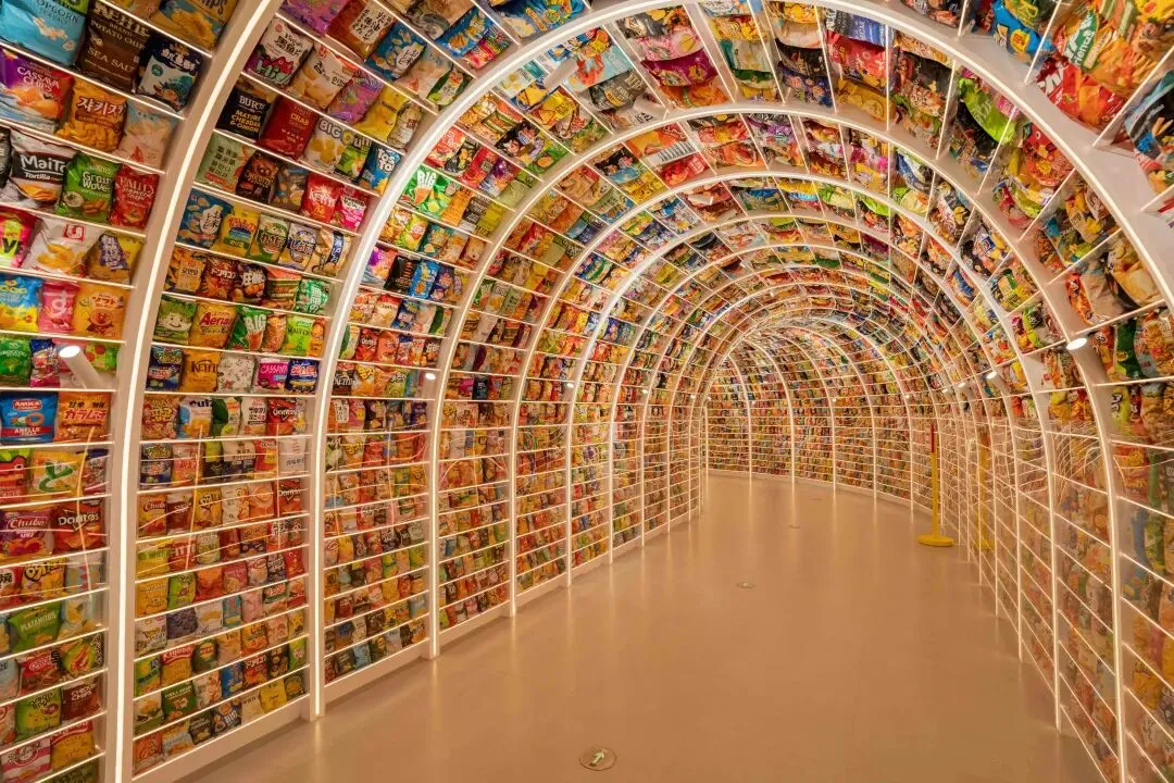 区别于传统零食卖场,“零食王国”以沉浸式体验为核心,将“超大体量”转化为可深度参与的探索乐趣,“可逛、可玩、可拍、可买”的特色的让其成为长沙新晋网红打卡地。消费者进入大门后,将首先穿过“零食长廊”,长廊两侧墙面以真实膨化食品包装拼贴而成,用“新奇、好玩、轻松”的空间节奏,帮助消费者快速完成从日常场景到快乐王国的绪切换。