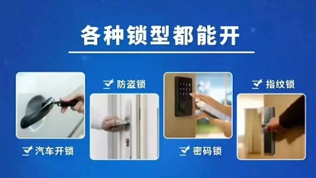 上门开锁:包括各种防盗门开锁、智能锁开锁、门禁开锁、保险柜开锁、汽车开锁、厨房门、卧室门、卫浴门开锁、卷闸门开锁、玻璃门开锁等。