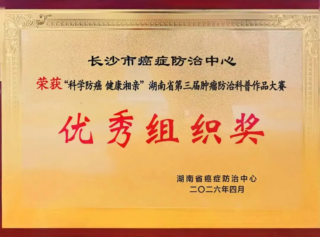 4月11日,“科学防癌 健康湘亲”湖南省第三届肿瘤防治科普大赛在长沙举行,长沙市癌症防治中心凭借出色的组织工作,荣获“优秀组织奖”。
