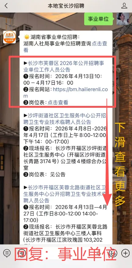 您也可以关注【本地宝长沙招聘】公众号,在聊天对话框回复【事业单位】获取报名入口、详细招聘情况等