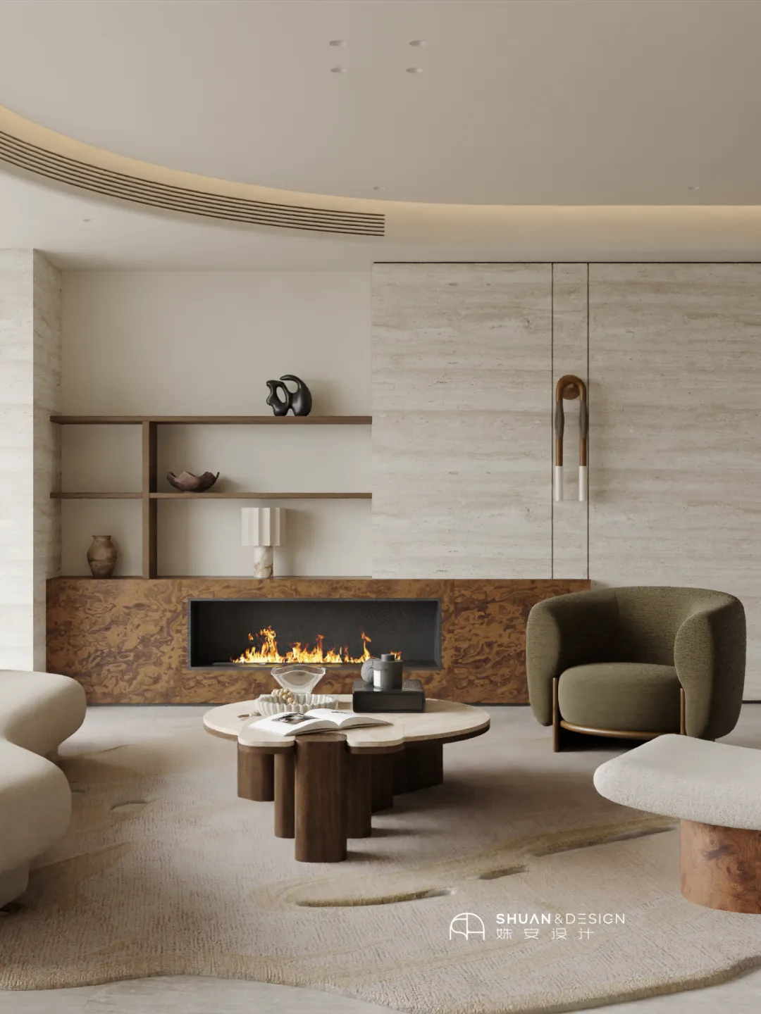 没有复杂的线条,没有多余的装饰,而是用「弧形元素」统一全局,搭配「温润木色、大理石与软包」的材质碰撞,再辅以精准的光影设计,将意式的奢华、中古的复古与现代的舒适完美融合。