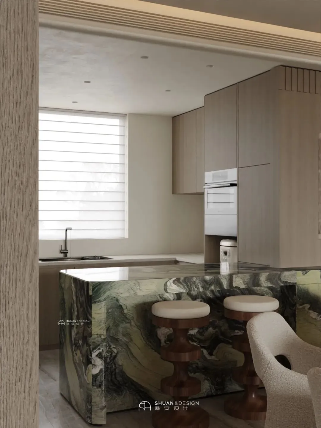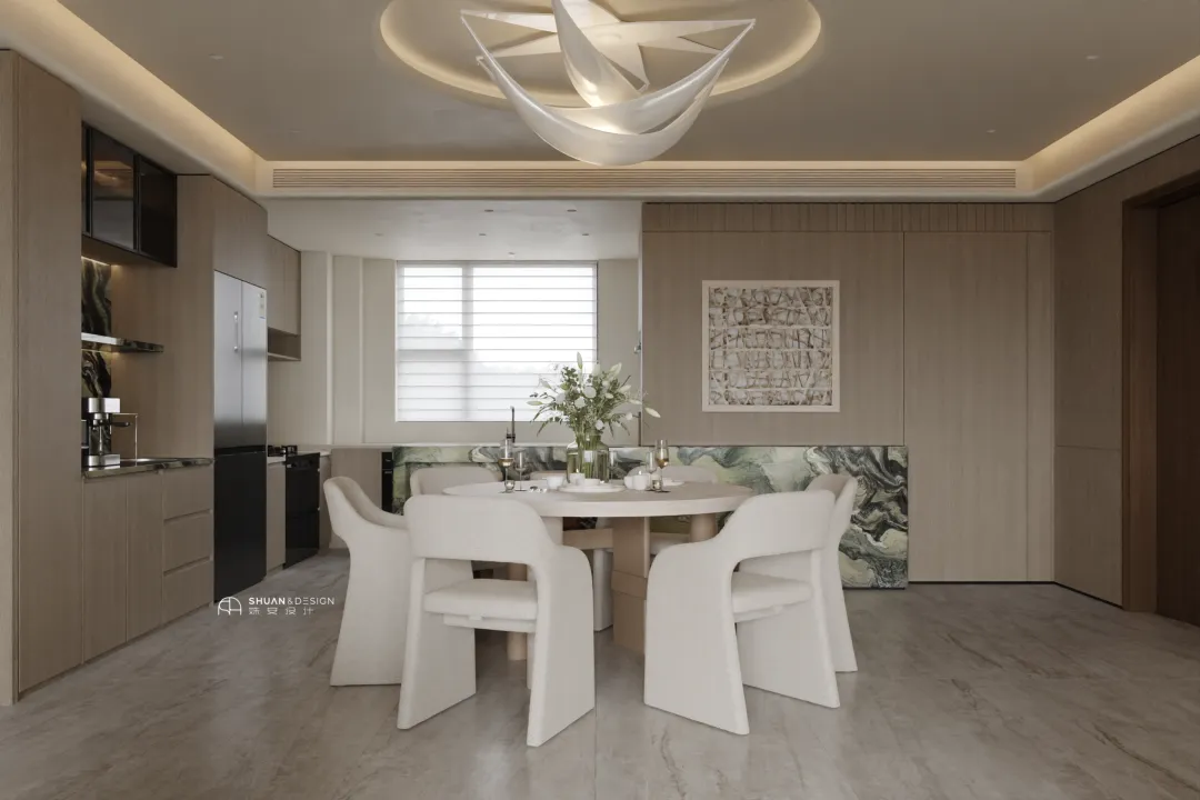 圆形餐桌搭配线条流畅的白色悬浮椅,简约又复古;一旁的绿色石材岛台搭配高脚凳,既是厨房与餐厅的过渡,也是家人朋友小聚的社交角落——煮一杯咖啡、摆上小食,轻松解锁意式生活的松弛感,烟火气与仪式感瞬间拉满。